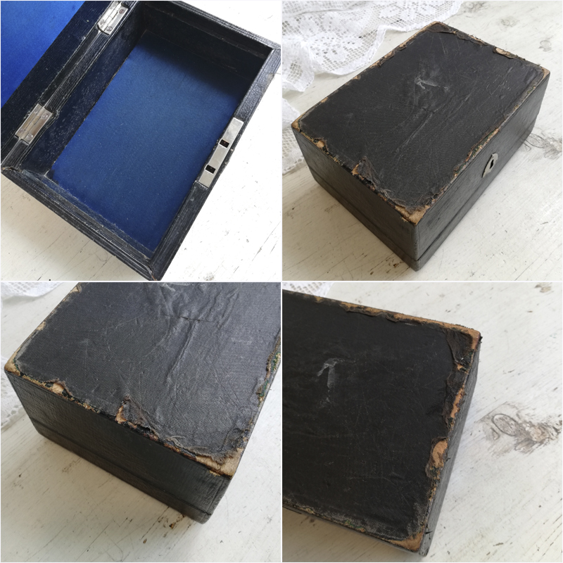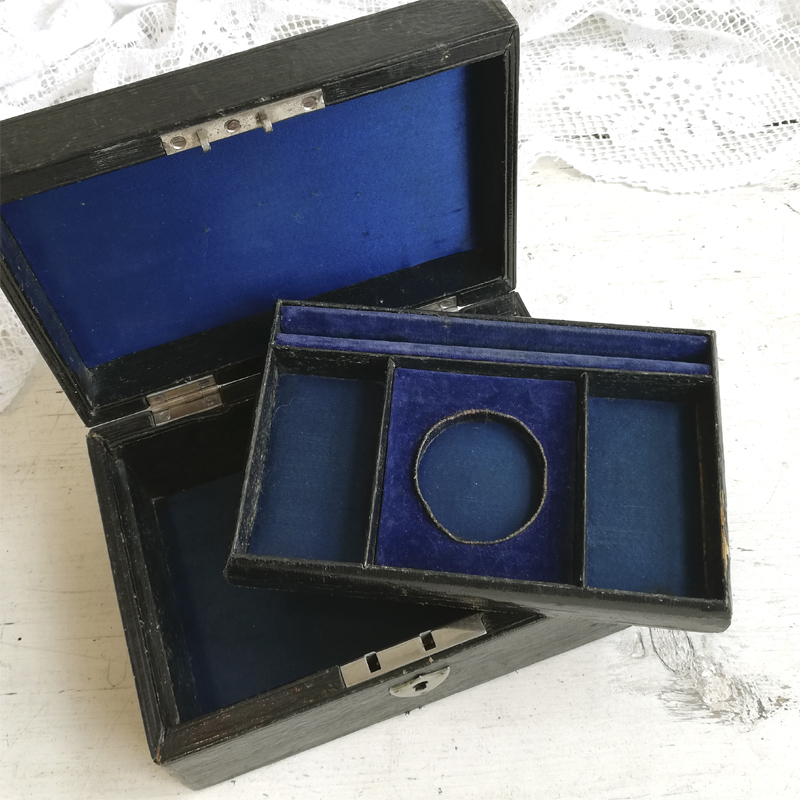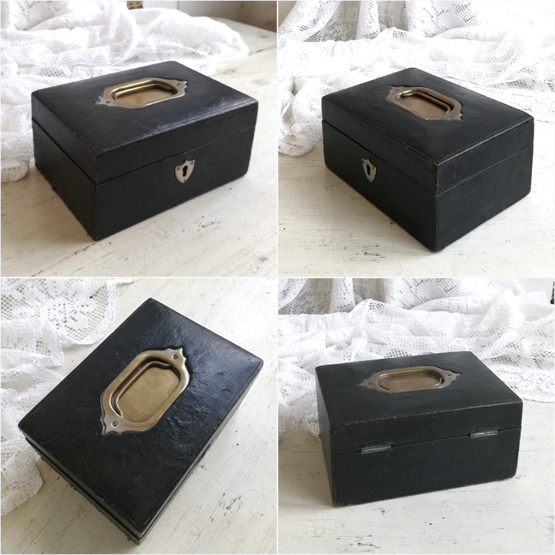 木製本体にブラックレザーで覆ったアンティークのジュエリーボックスです。