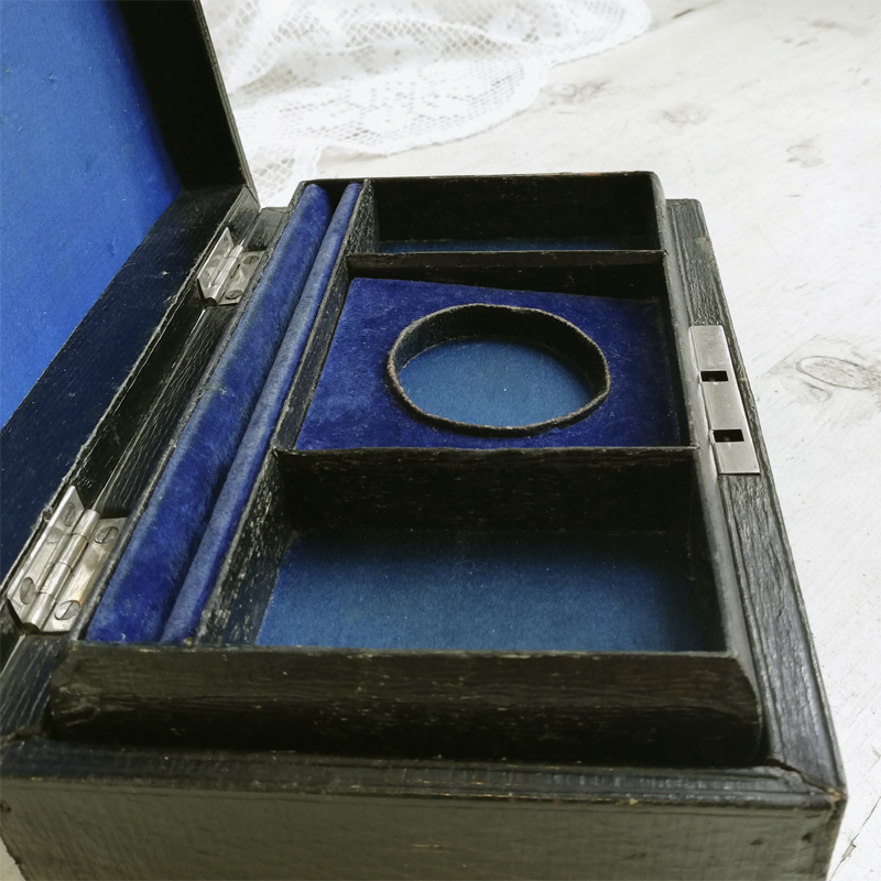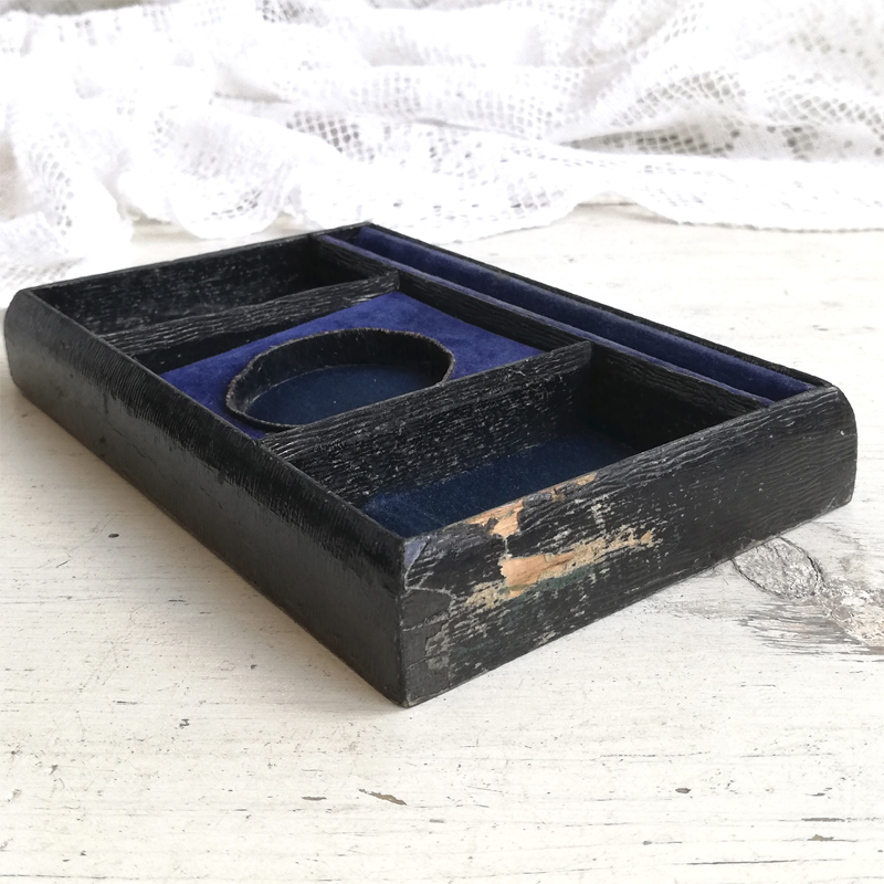 取り外しのできるトレイは仕切りがあり、中央は懐中時計用、またリングやピアスが置ける溝があります。