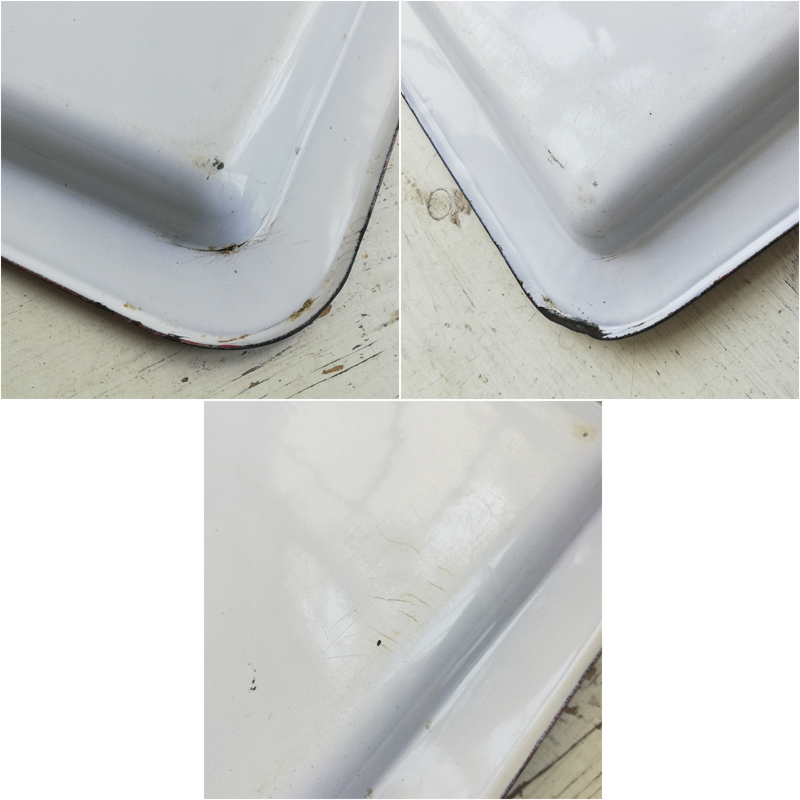 トレイの縁や角にホーローの欠けなどの傷みがあります。