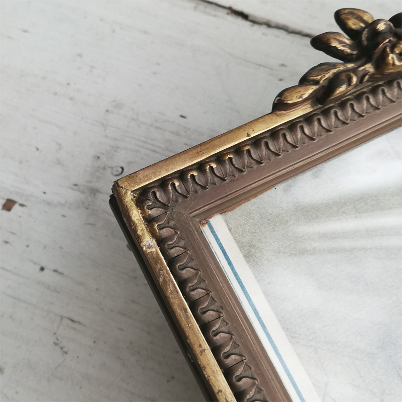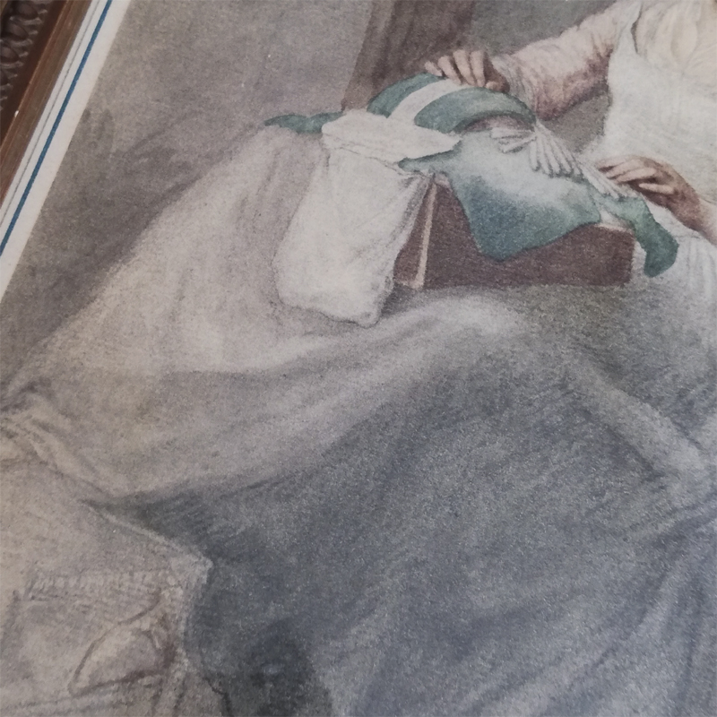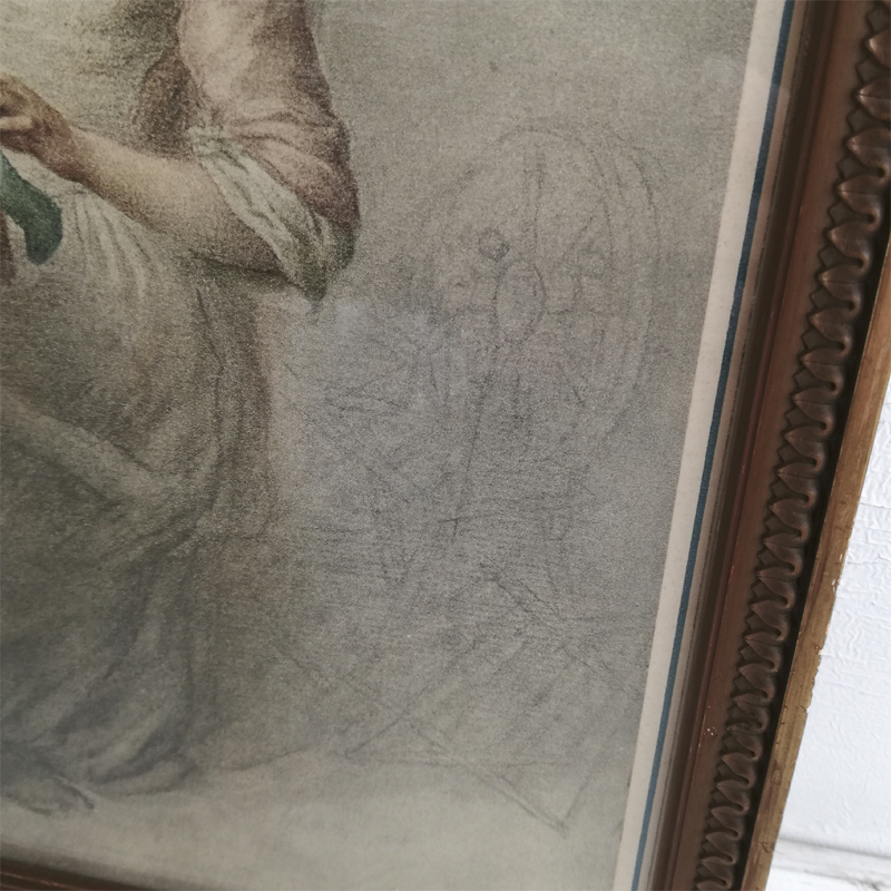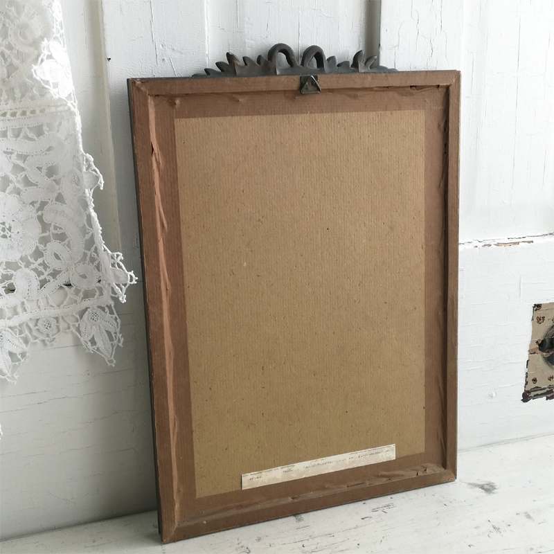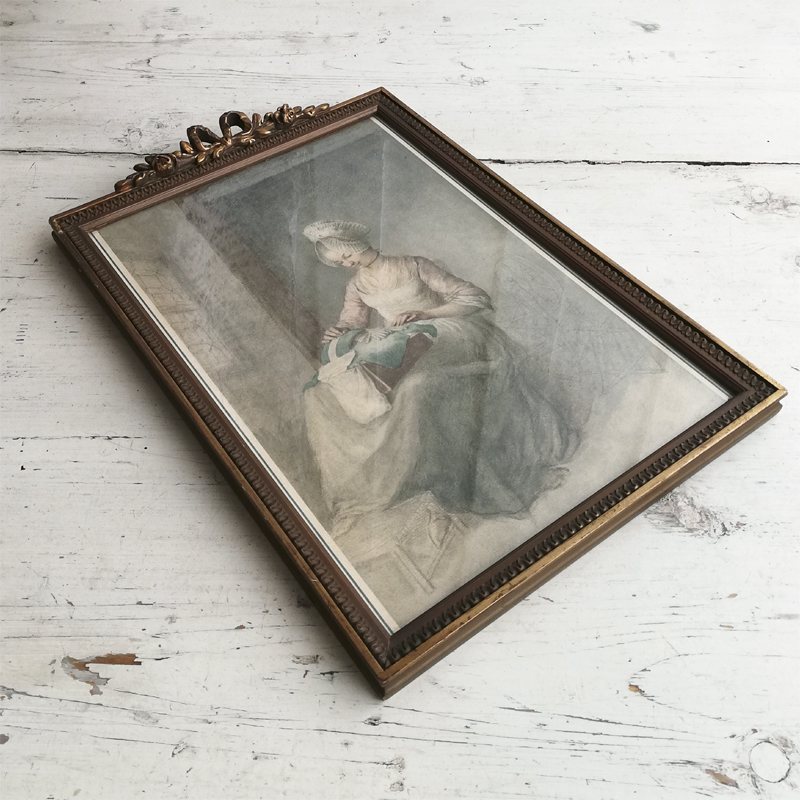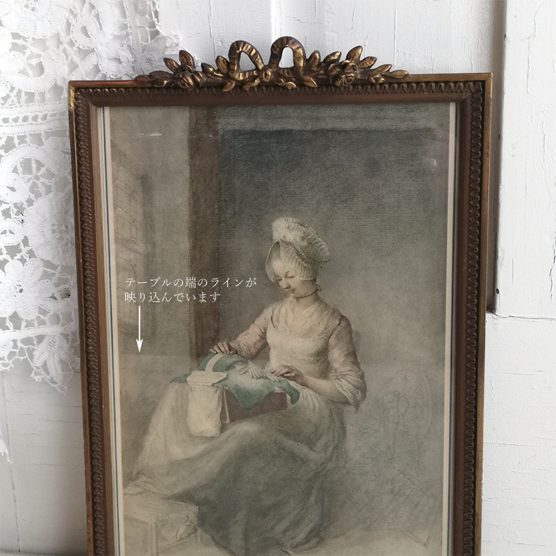 レースのボネを被り美しい笑顔でボビンレースを編む女性の復刻リトグラフリトグラフが入ったリボンと薔薇の装飾の額です。レースボネの繊細さや淡いピンクのブラウスの質感が伝わってくる美しい絵です。