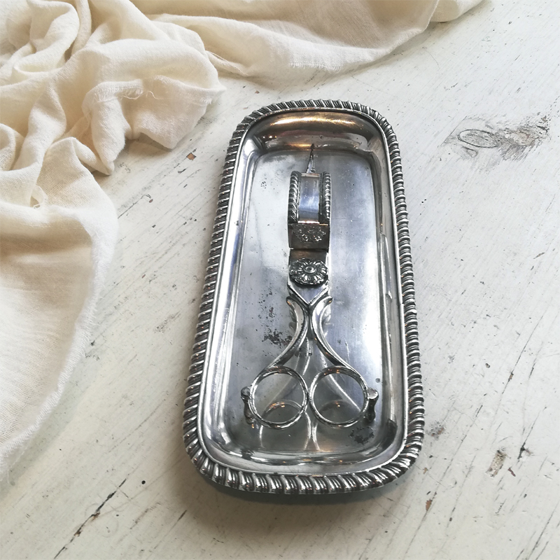 ガドルーンボーダーで飾られたトレイ付きのキャンドルスナッファーです。