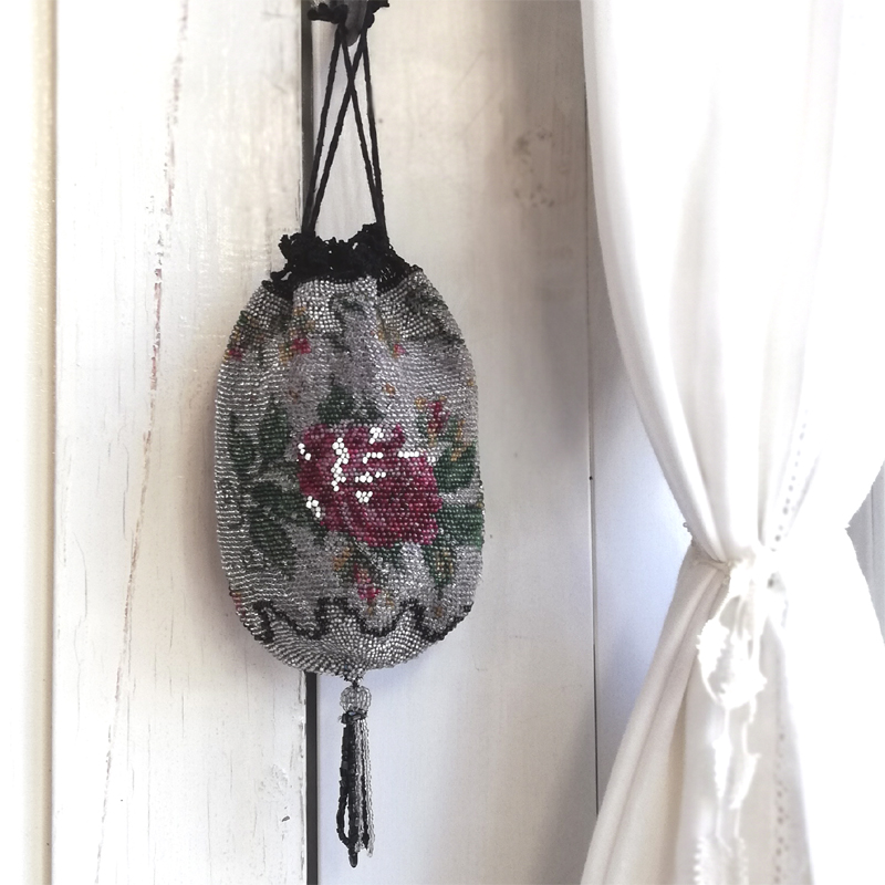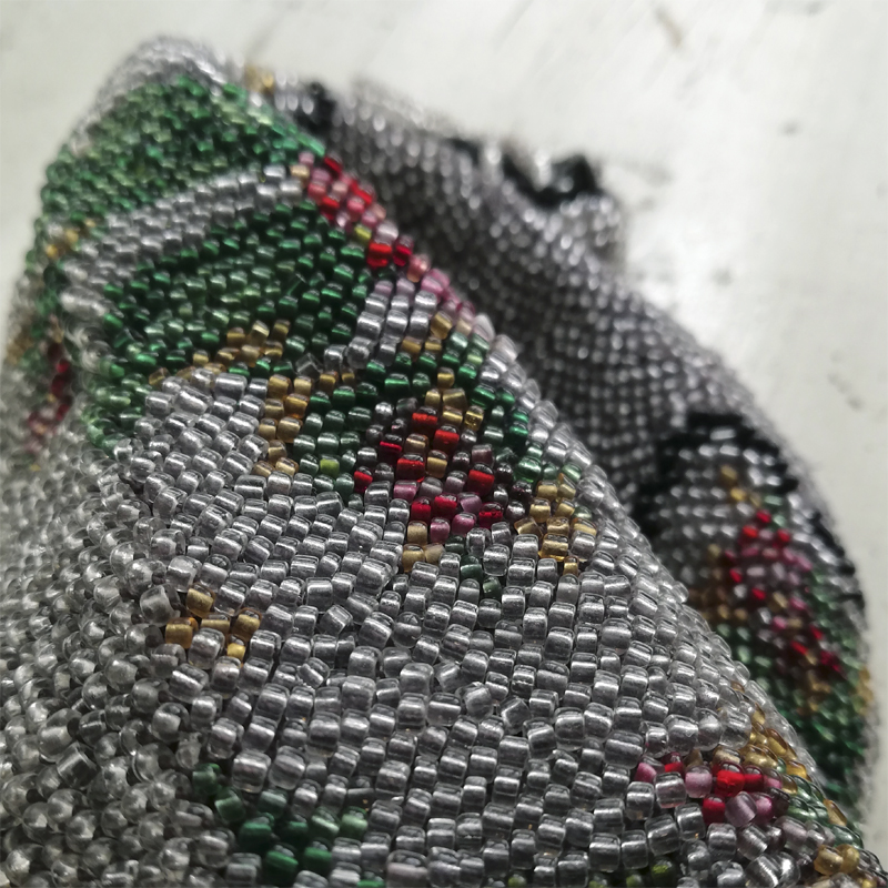 古い時代のビーズですので形や大きさは不揃いですが、花びらや葉には特に小さい1.3ミリ程のビーズが使われています。
