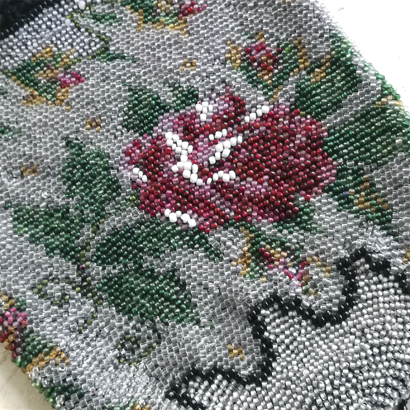 薔薇以外のベースはクリアビーズが使われていますが土台布がグレーですので、仕上がりの色もグレーに見えます。ビースの輝きもありますのでシルバーっぽく見えるのも綺麗です。