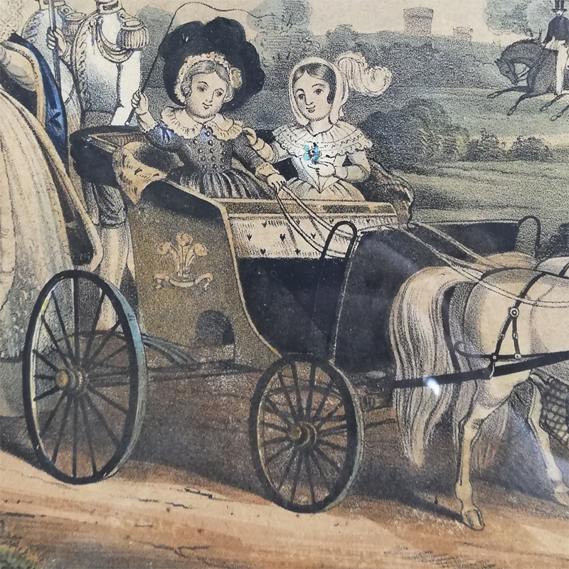 版画に薄く手彩色が施され当時のほのぼのとしたロイヤルファミリーの日常が垣間見れる作品です。
