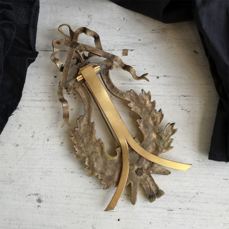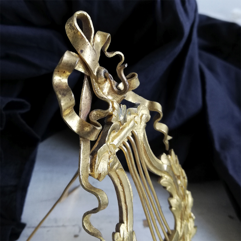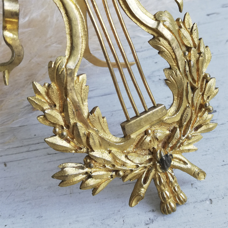 竪琴のリラにリボンと月桂樹を飾った優雅なブロンズの懐中時計ホルダー。