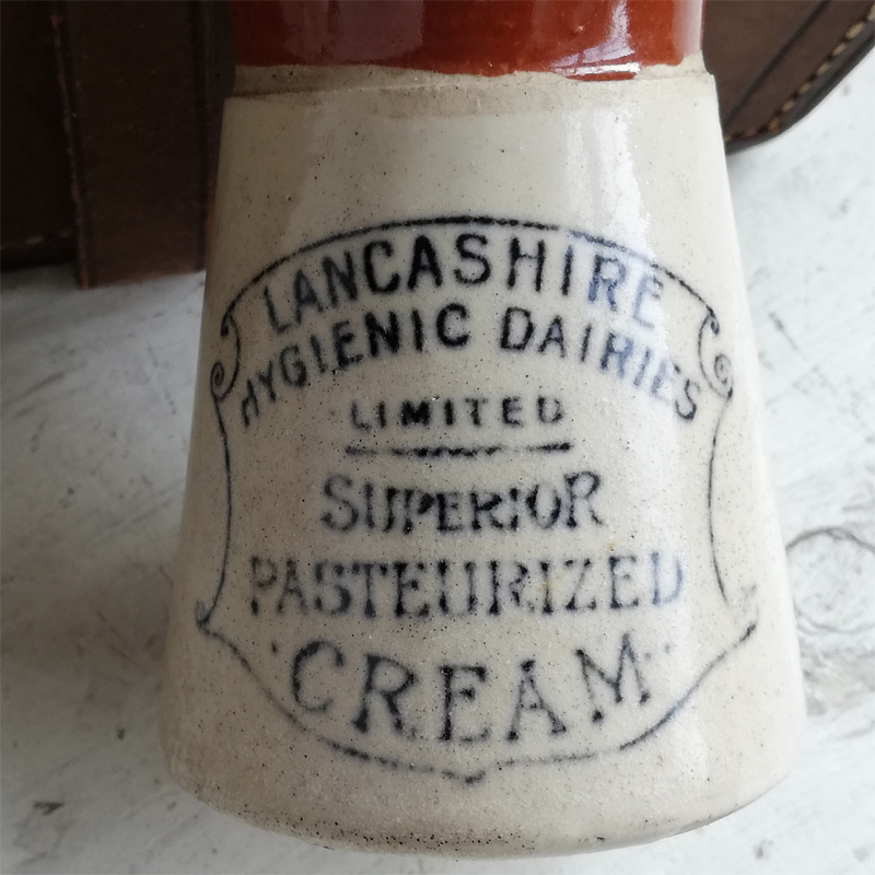 ツートンカラーの円錐形に黒いロゴが印象的なストーンウェアのポットは、Lancashire Hygienic Dairies LTDが19世紀末から20世紀初頭にかけて製造した低温殺菌クリームを入れる為の容器です。