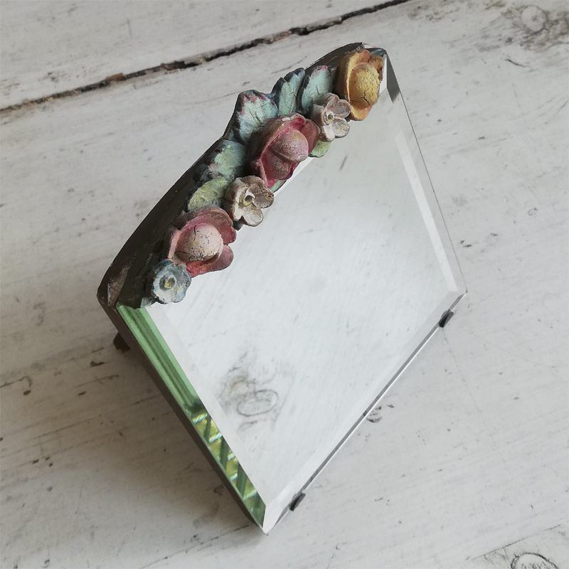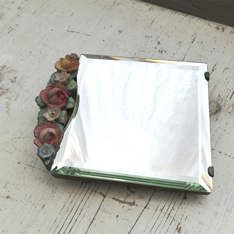 こちらはパステルカラーの薔薇や勿忘草が並んだバーボラで飾られたスクエアの小ぶりなミラー。
