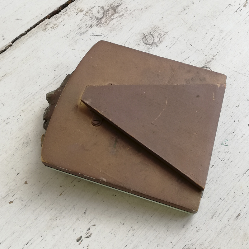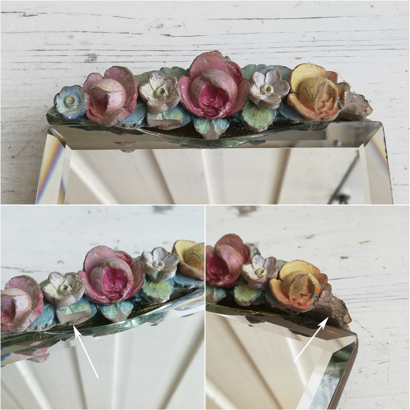 粘土という性質上、ヒビや欠け、矢印で示した葉の先や右端の花の欠損がありますが、雰囲気を損なう程度ではないと思います。後年の硬い素材ではなく古手のタイプならではの優しい質感が魅力です。