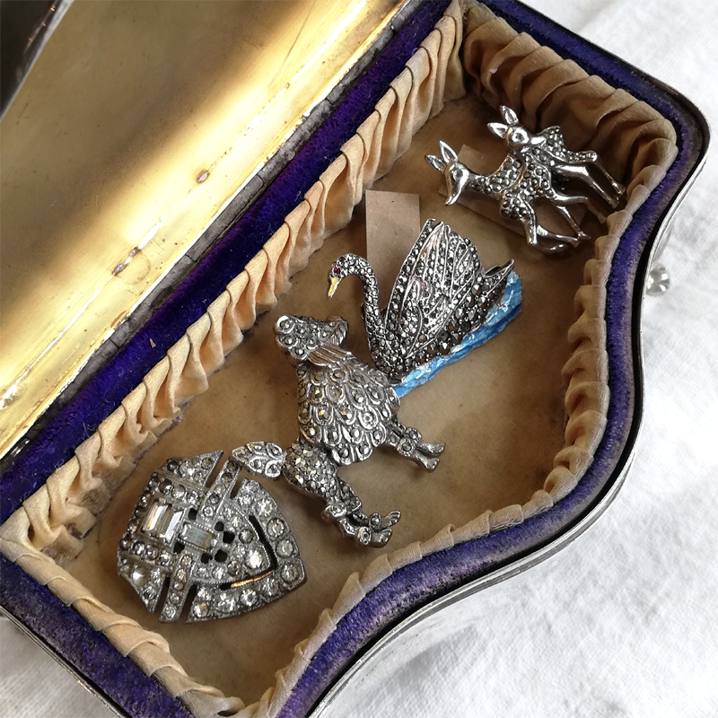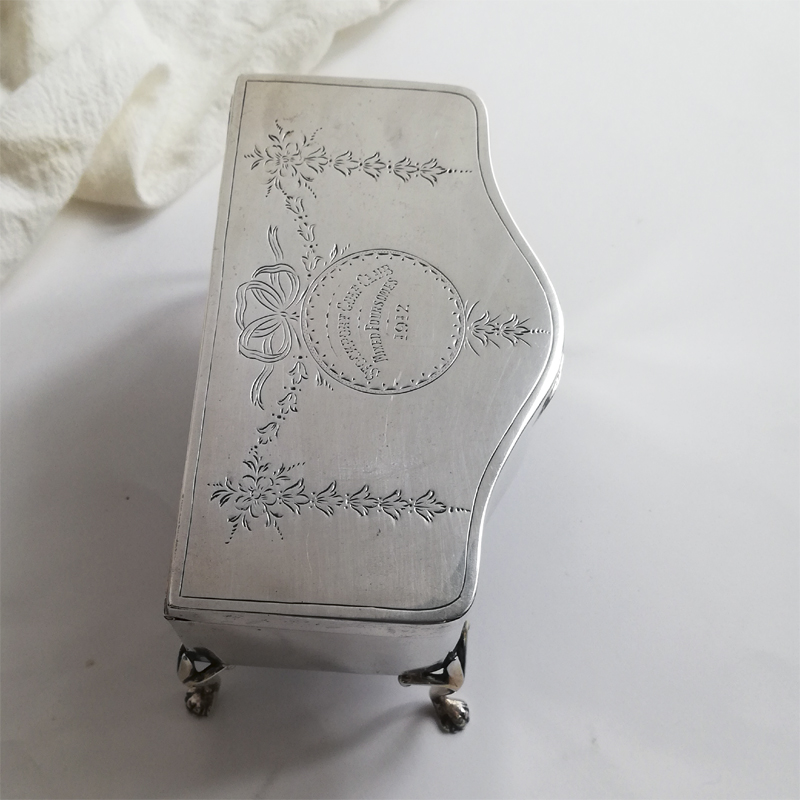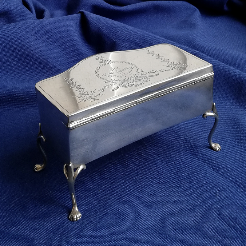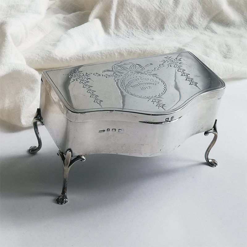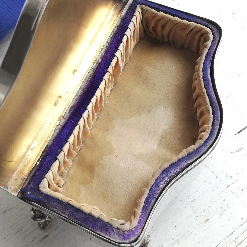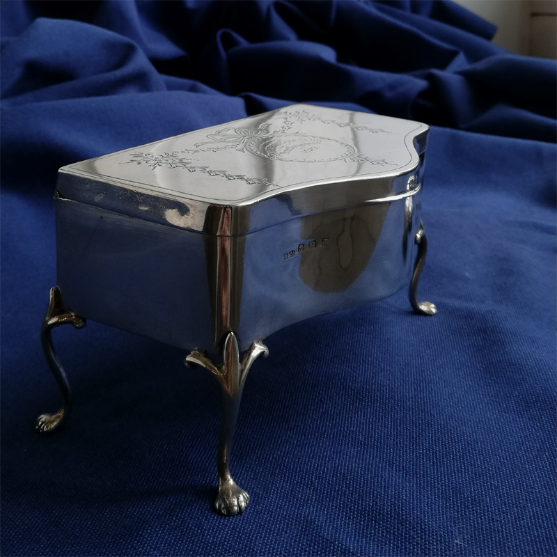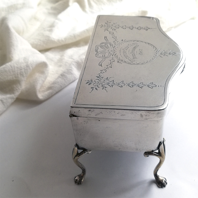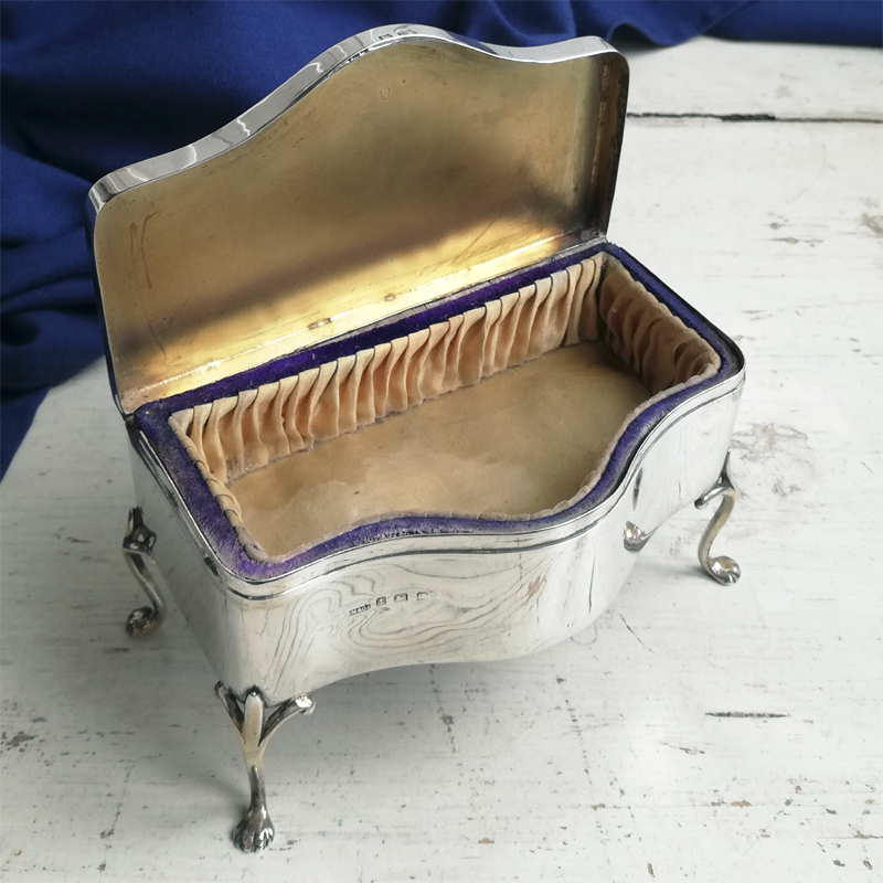 まるでミニチュア家具のようなシェイプとライオン脚を持つシルバー製のジュエリーボックスです。