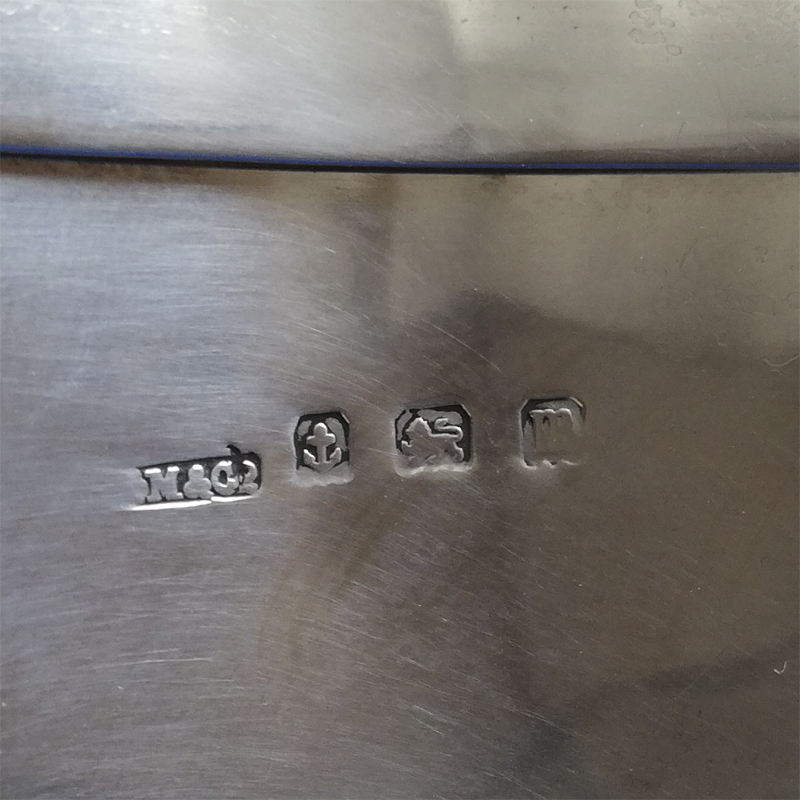 蓋にスタンダードマークと1911年のデイトレター、本体にメーカーズマーク、バーミンガムのアセイオフィスマーク、スタンダードマーク、1911年のデイトレターのホールマークがあります。