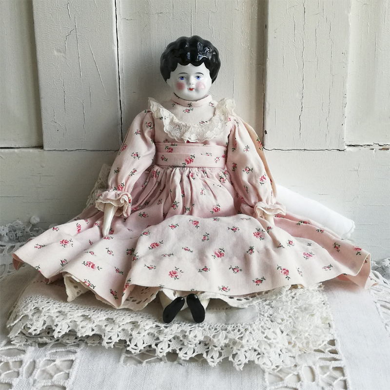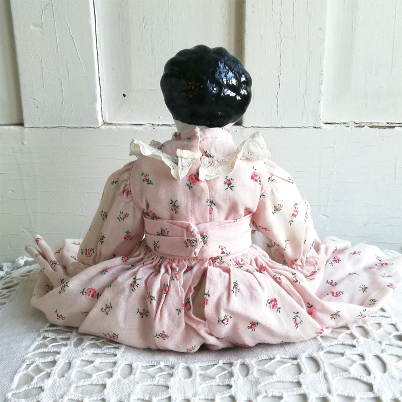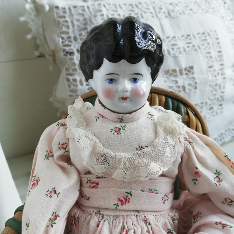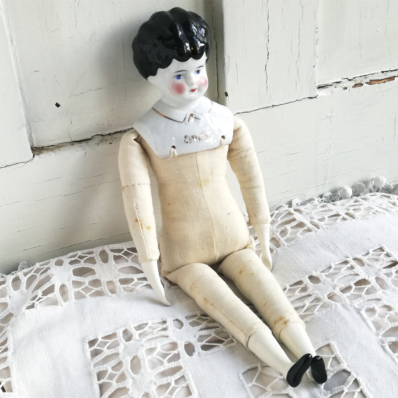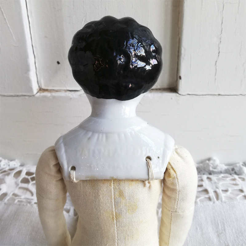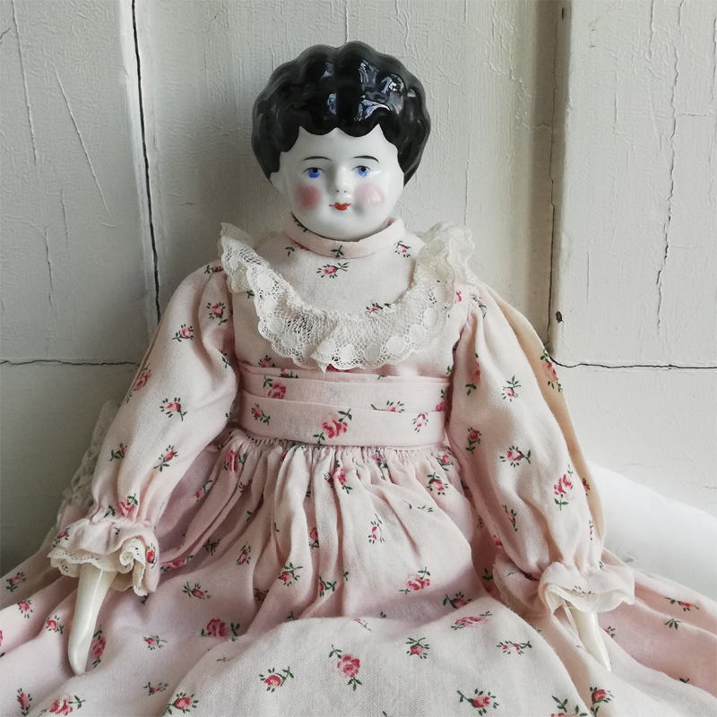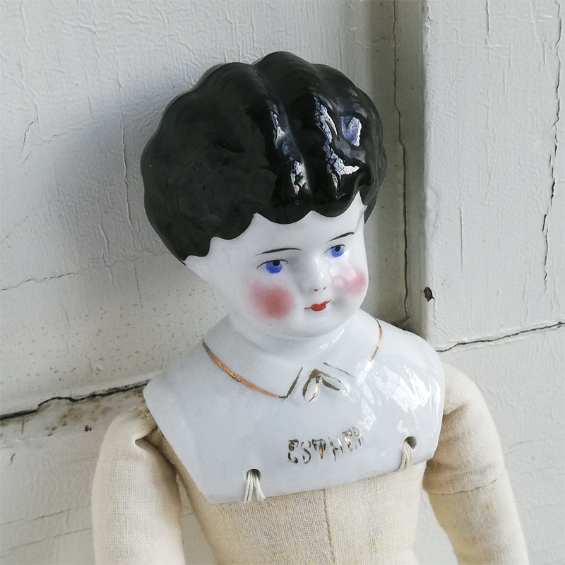 白磁のフェイスに青い目、赤い口、赤く染まった頬などバランス良く目鼻口が描かれた綺麗な顔立ちのチャイナヘッドドールです。ゴールドで描かれた襟と胸元にESTHERと名前が印されています。