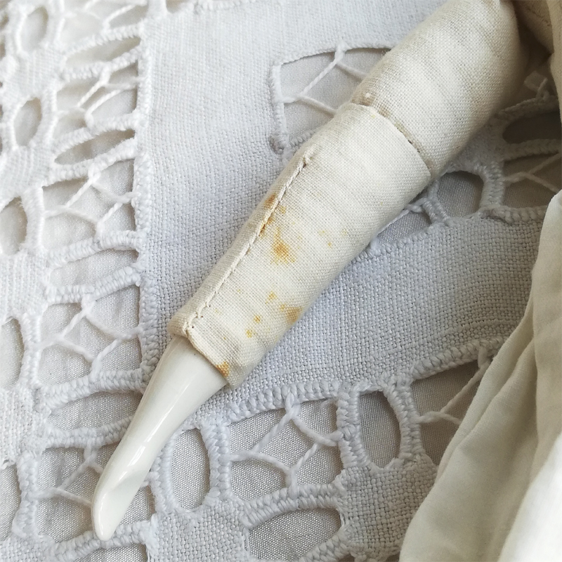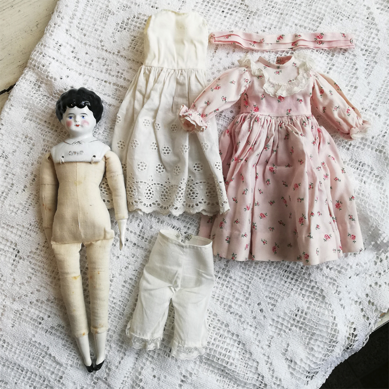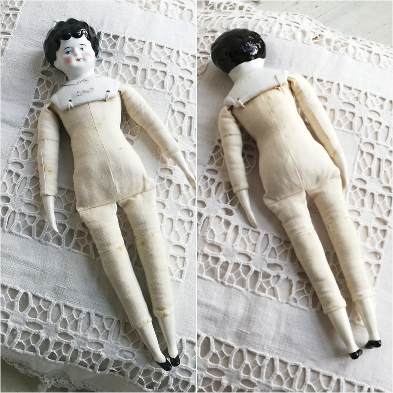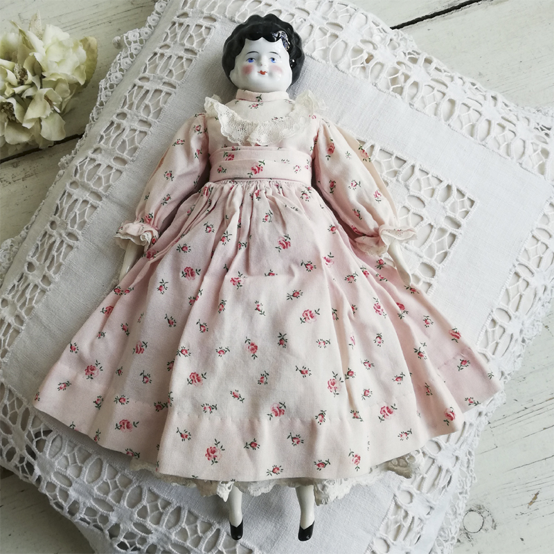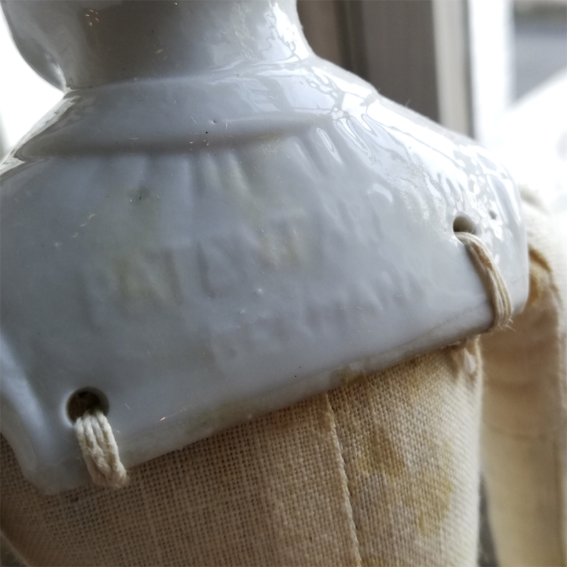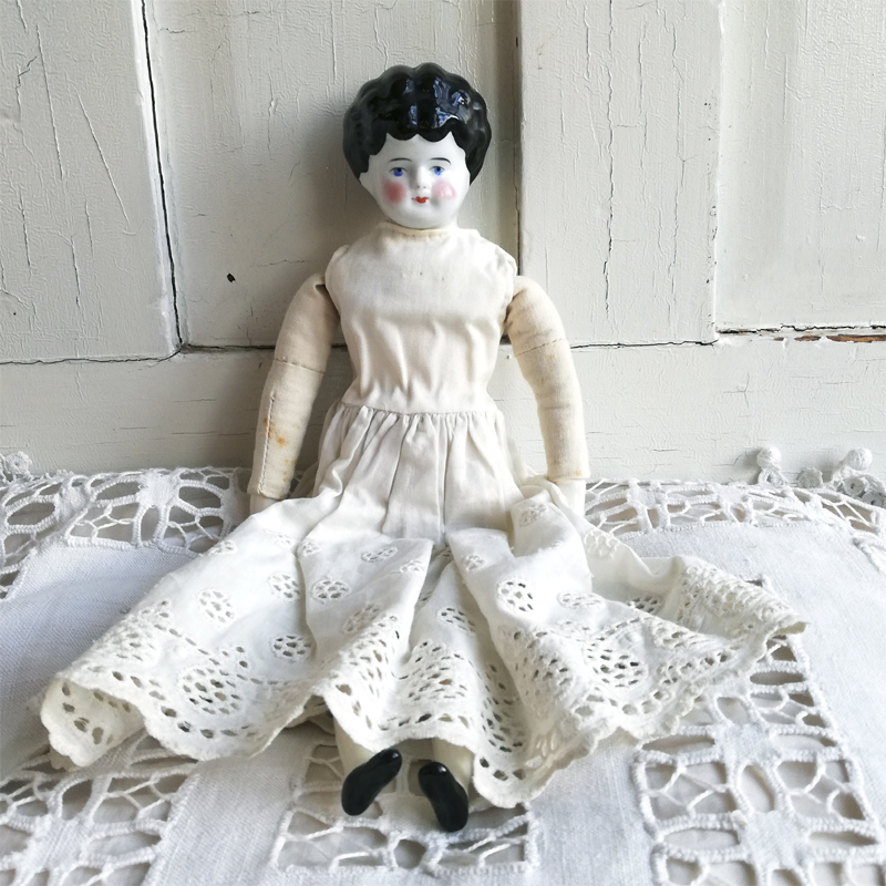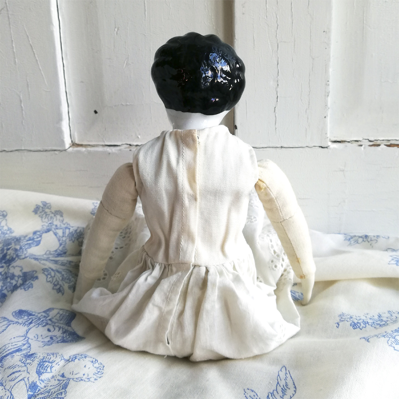白磁のフェイスに青い目、赤い口、赤く染まった頬などバランス良く目鼻口が描かれた綺麗な顔立ちのチャイナヘッドドールです。ゴールドで描かれた襟と胸元にESTHERと名前が印されています。