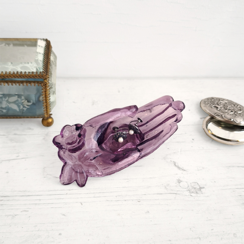 アメリカの老舗ガラスメーカーDegenhartによる、ハンドモチーフの小さなガラスディッシュです。