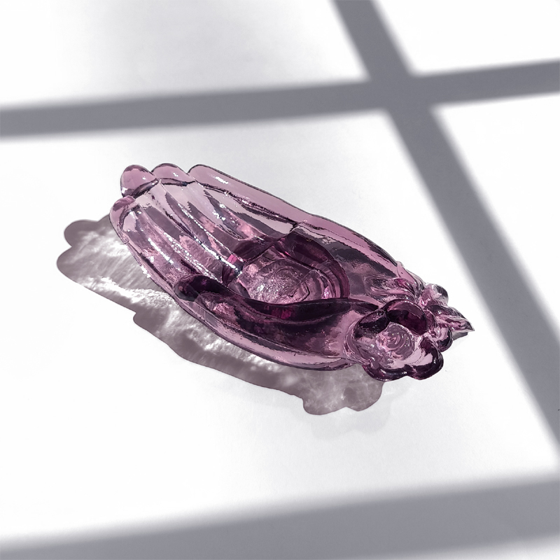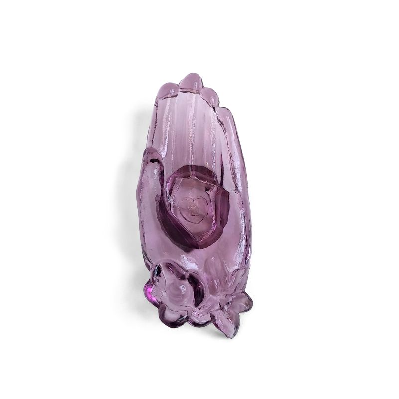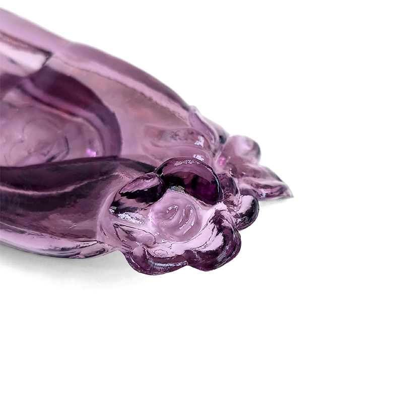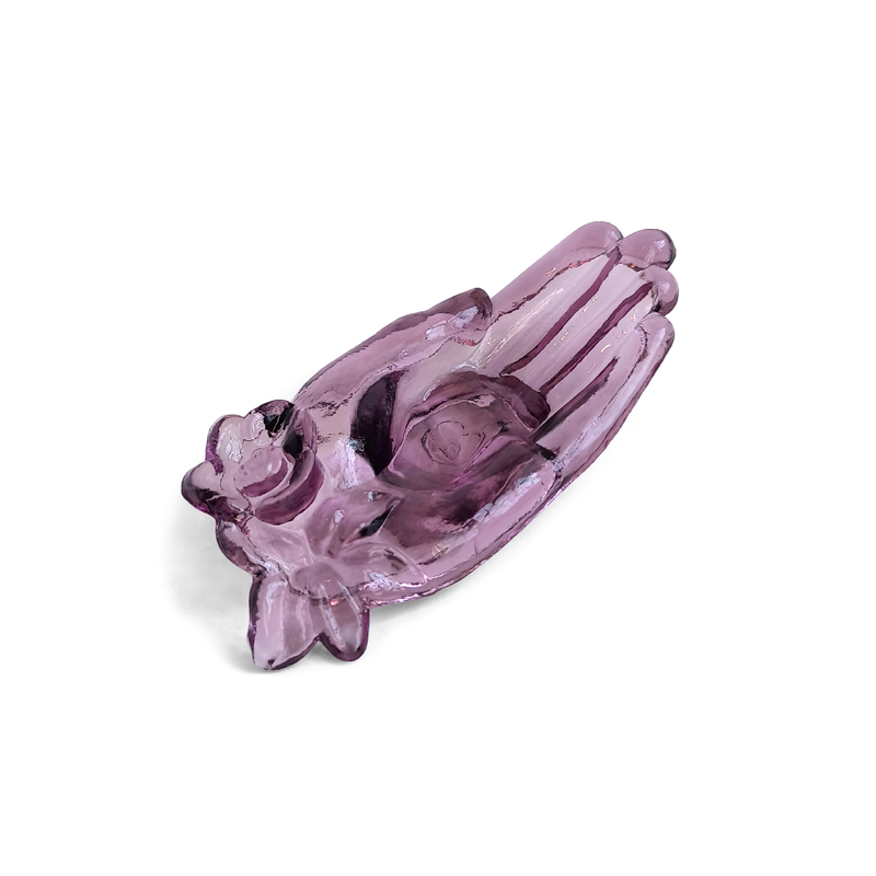 手のひらをそっと差し出したような優雅なフォルムに、透き通るライトパープルのガラスがやわらかな光を添えます。