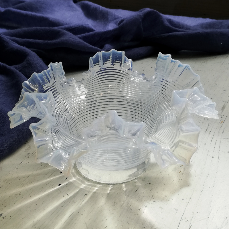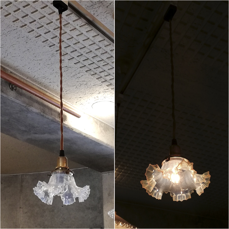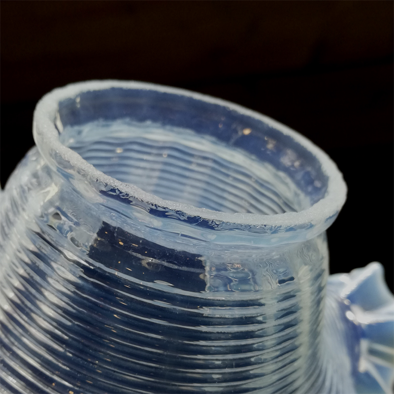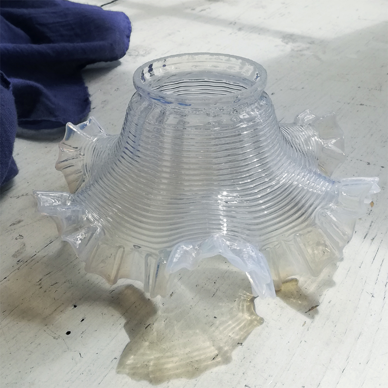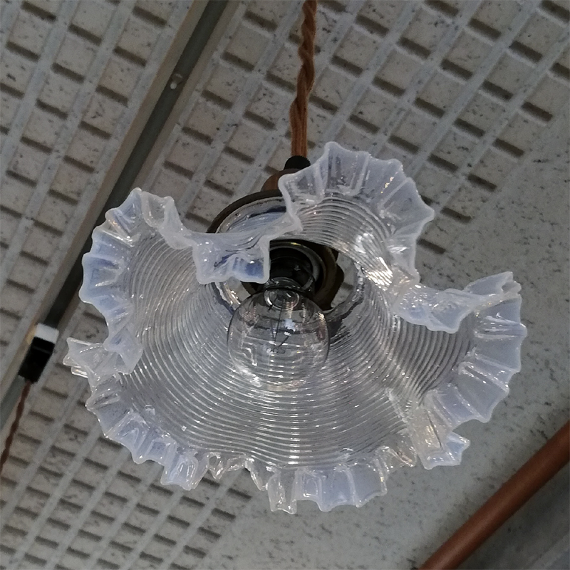 青白い乳白色が独特の雰囲気を持つオパールセントガラスのランプシェードです。