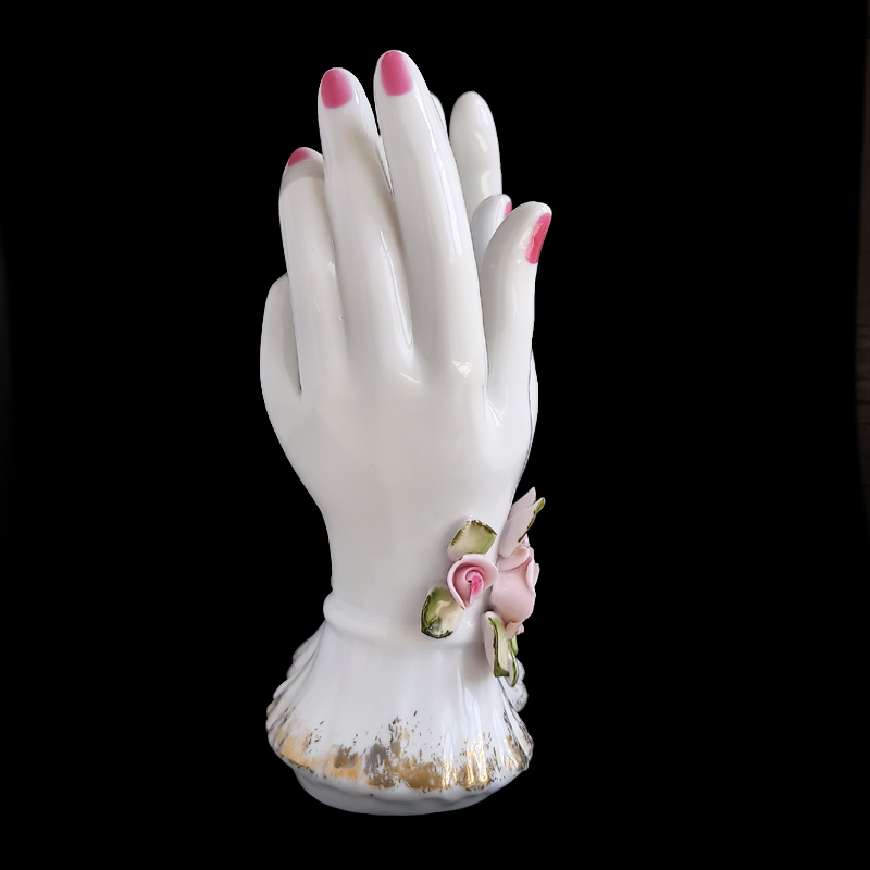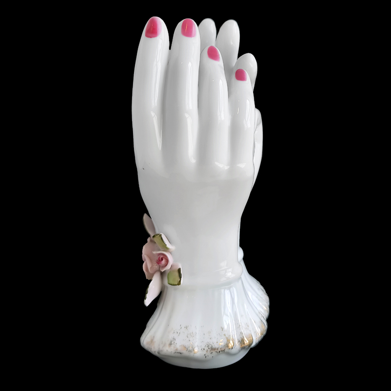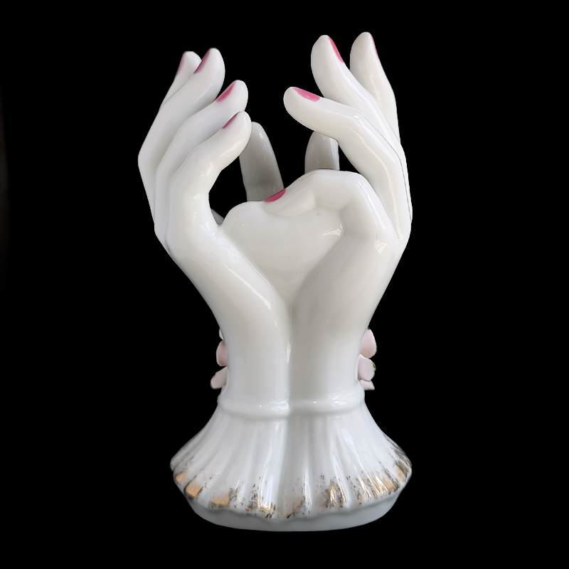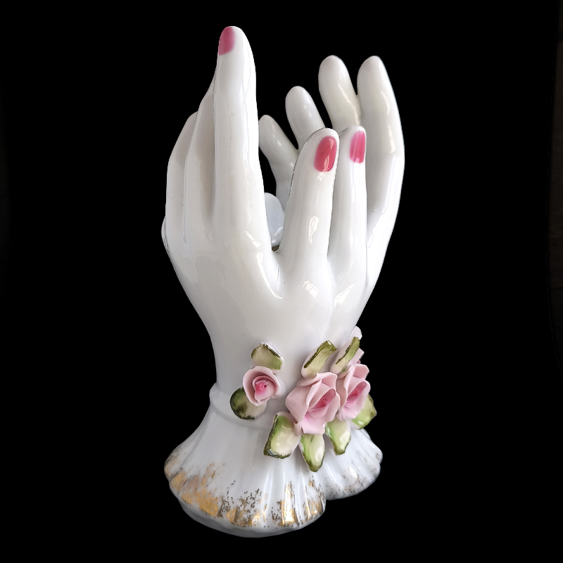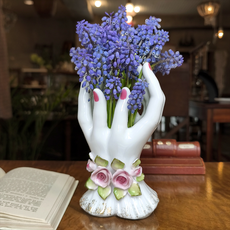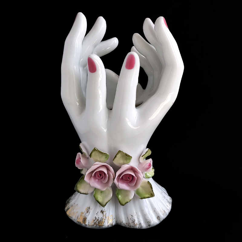 両手を添えたデザインがインパクトのある陶磁器製のフラワーベース。