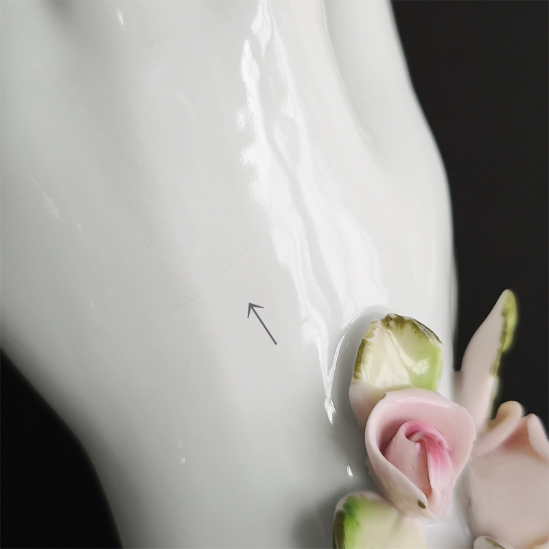 左手の甲にの貫入がありますが、陶磁器の表面にかけるガラス質のコーティング部分なので耐久に問題ありません。