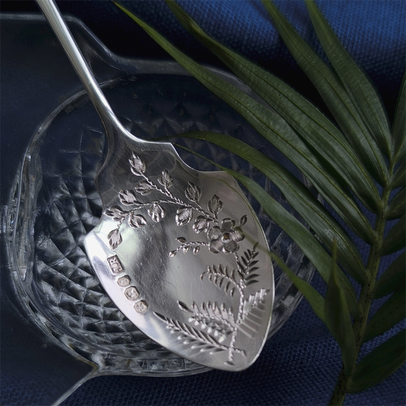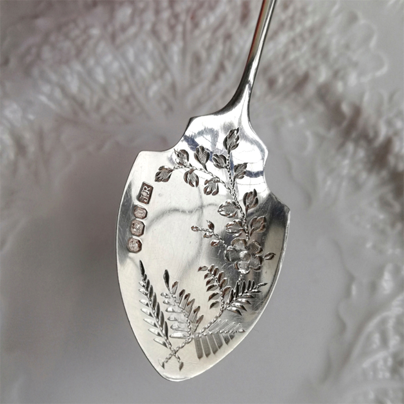 ボウル部分にワイルドローズとシダがエングレーヴィングされた純銀製のジャムスプーンです。