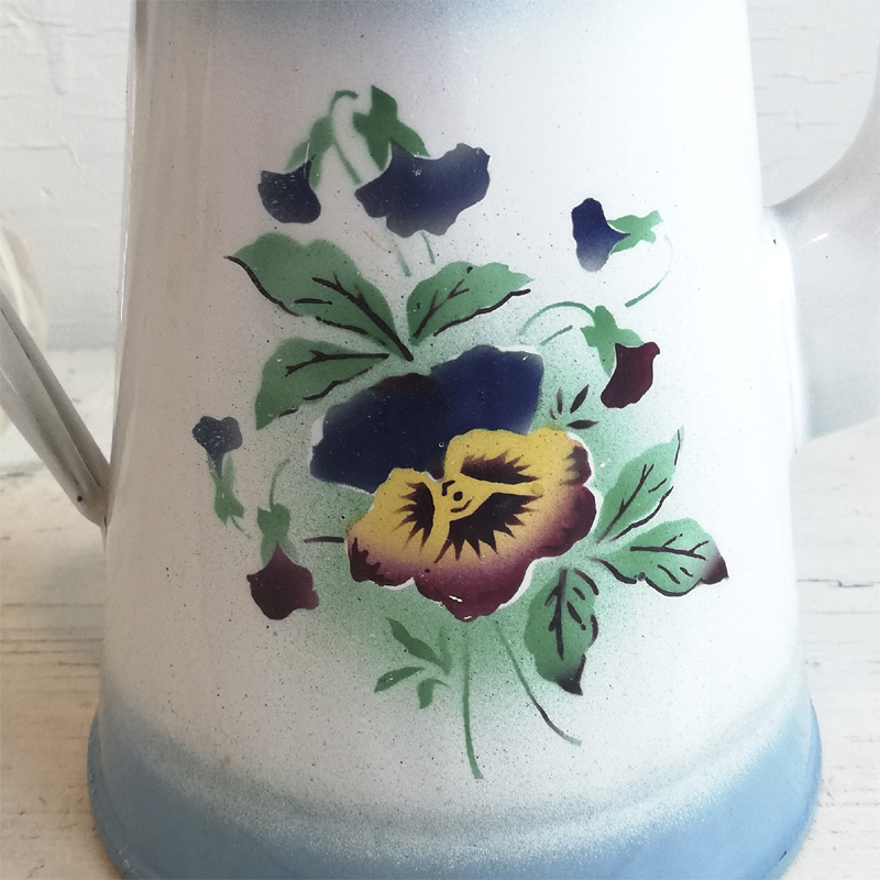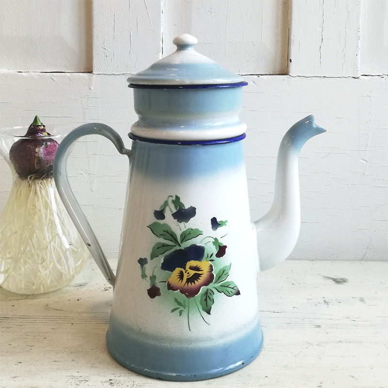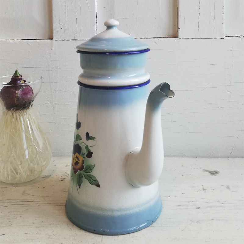 白地に淡いブルーのぼかしが入ったホーローのコーヒーポットです。