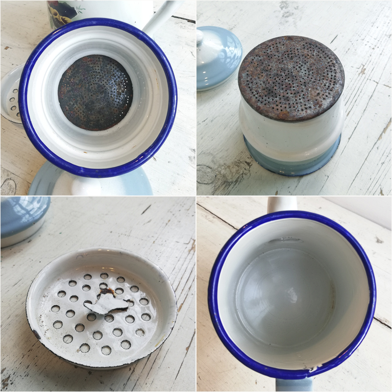 フィルターのブリキ部分に錆びや、ちらほらとホーローの欠けもありますが、ポットの内側は大変綺麗な状態で全体的に大変良い状態です。