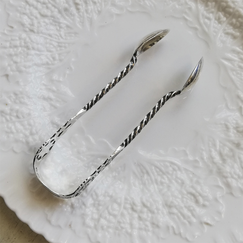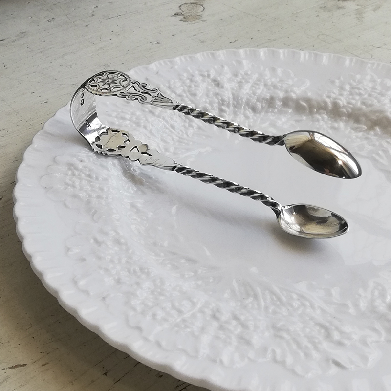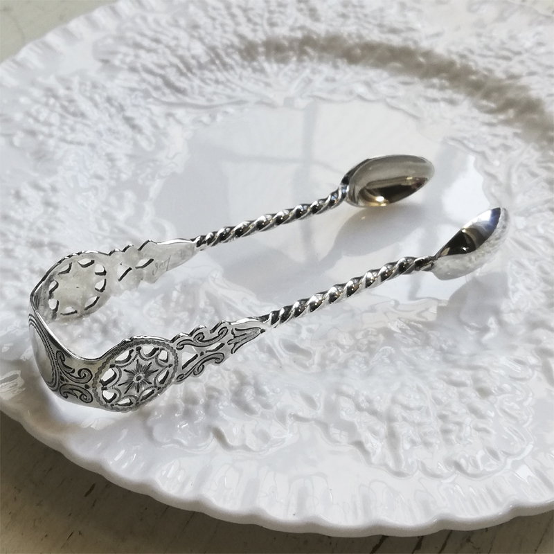 ブライトカットに透かし彫りにねじりのハンドルと小さな道具の中に手の込んだ職人技が息づくシュガートングです。当時のお茶の時間がいかに貴重で大切だったのかを感じます。