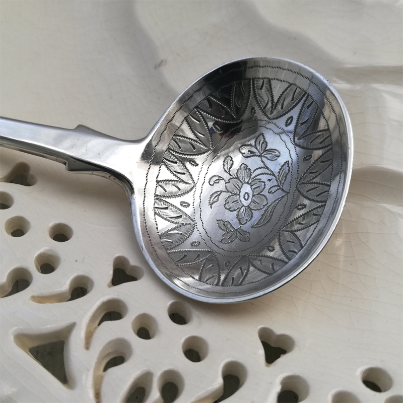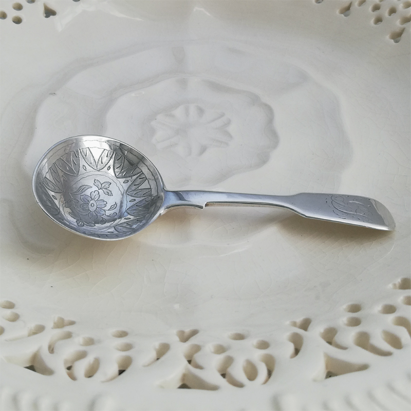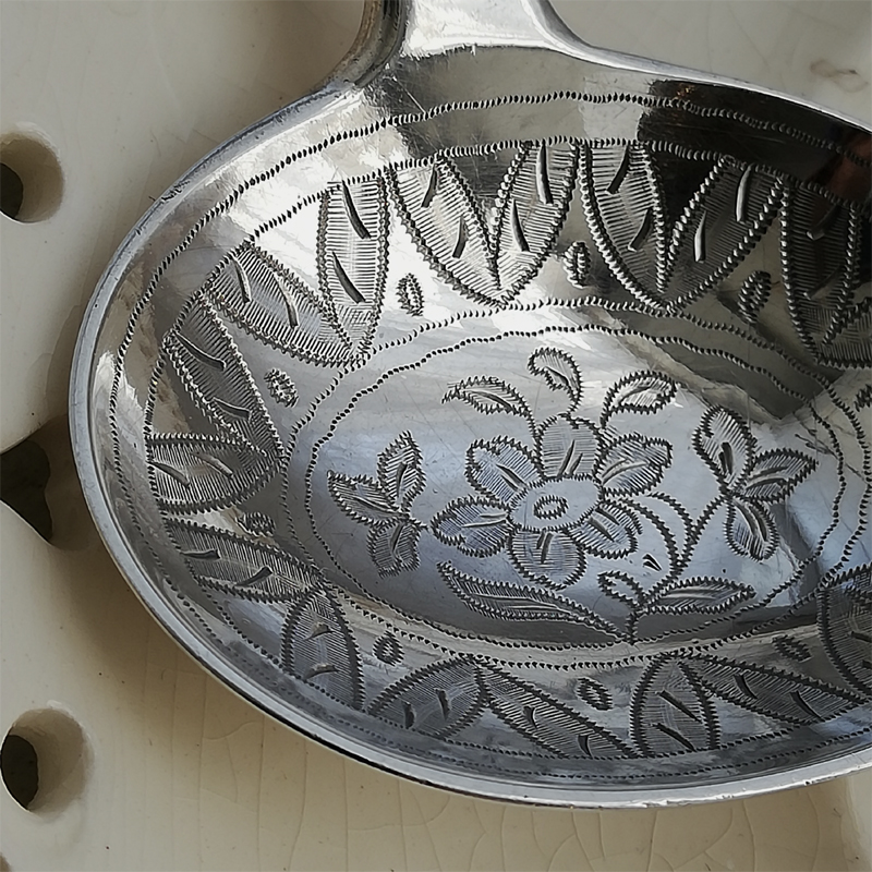 ボウル部分に非常に細かなブライトカットが施されたスターリングシルバーのティーキャディスプーンです。