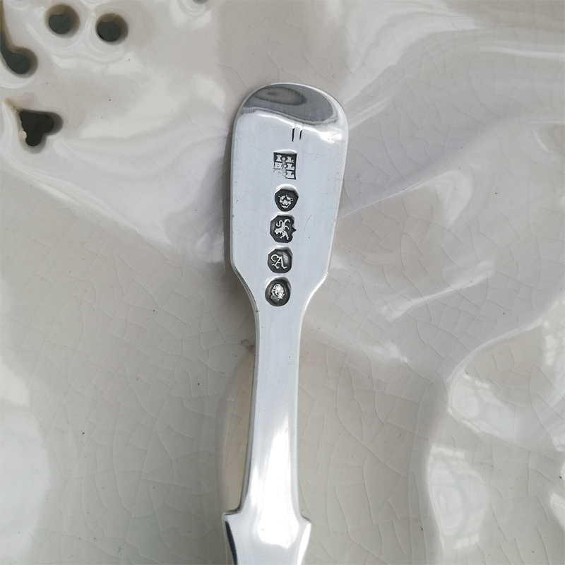 ハンドルの裏面にJohn, Henry & Charles Liasの工房マーク、ロンドンのアセイオフィスマーク、スタンダードマーク、1836年のデイトレター、ウィリアム4世のデューティーマークのフルホールマーク入りです。