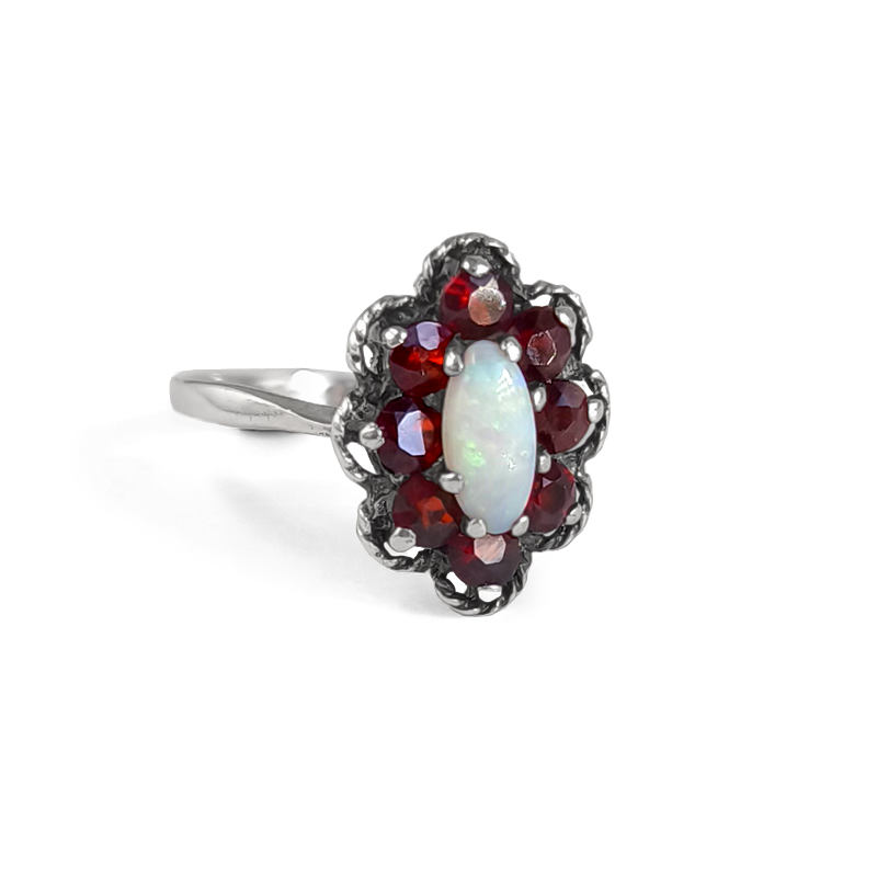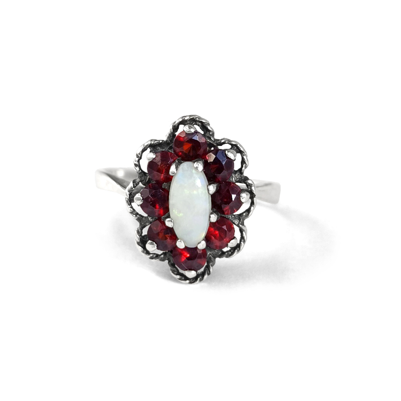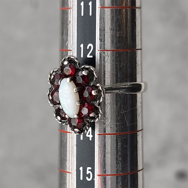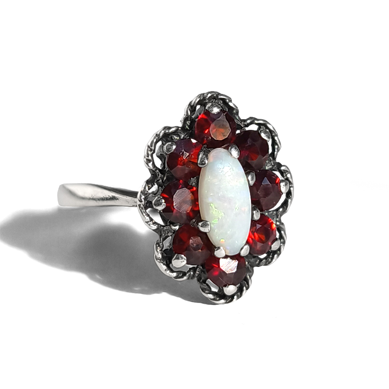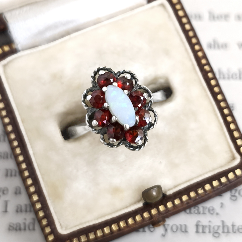 深みのある赤が印象的なガーネットと乳白色のオパールが柔らかな光を与える、コントラストの美しいリング。
