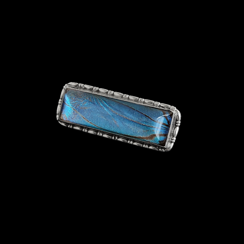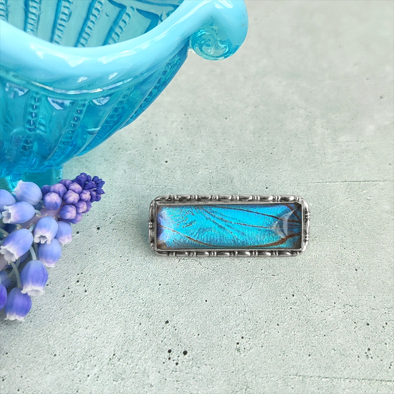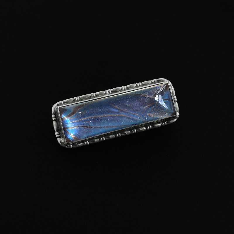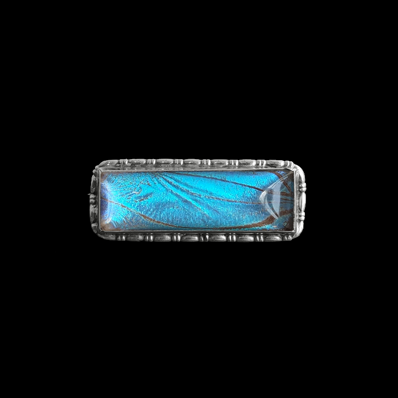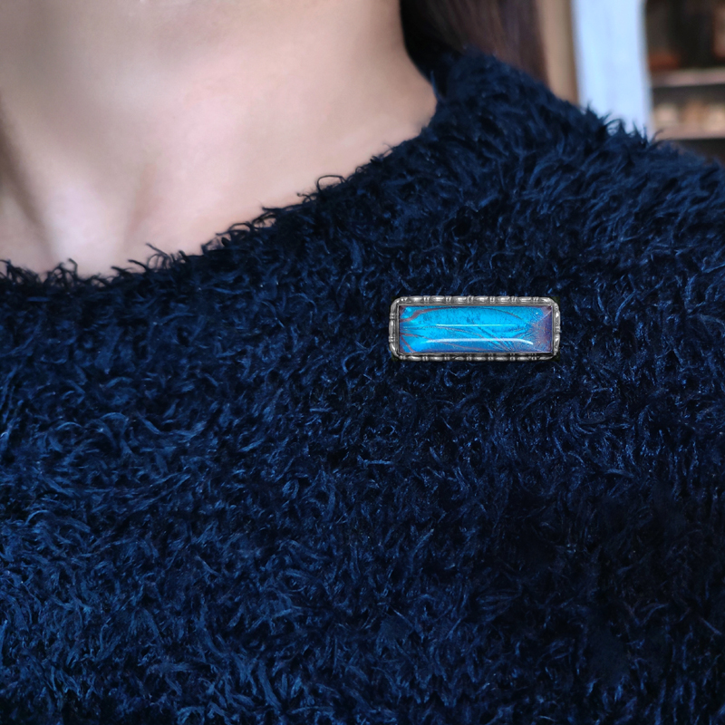 たっぷり厚みをとったドーム型のガラスに蝶の翅(ハネ)を閉じ込めたブローチ。