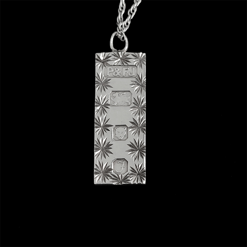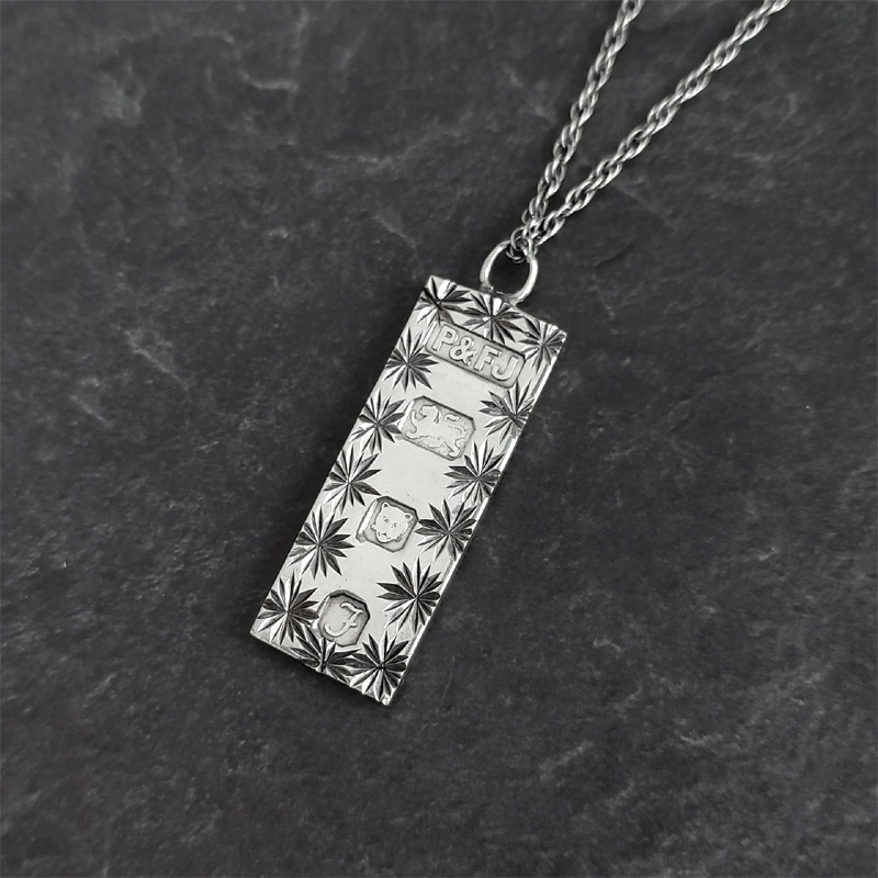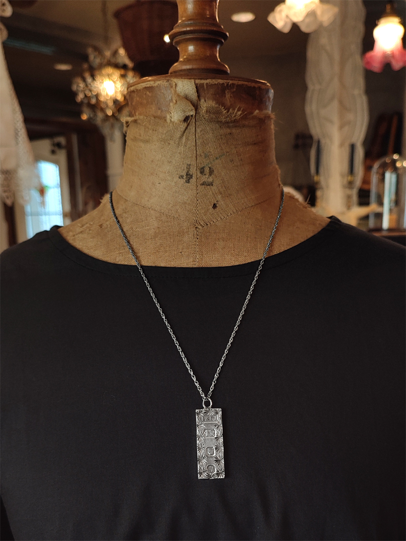 少し厚みのあるバータイプのペンダントトップに刻印が入ったネックレス。