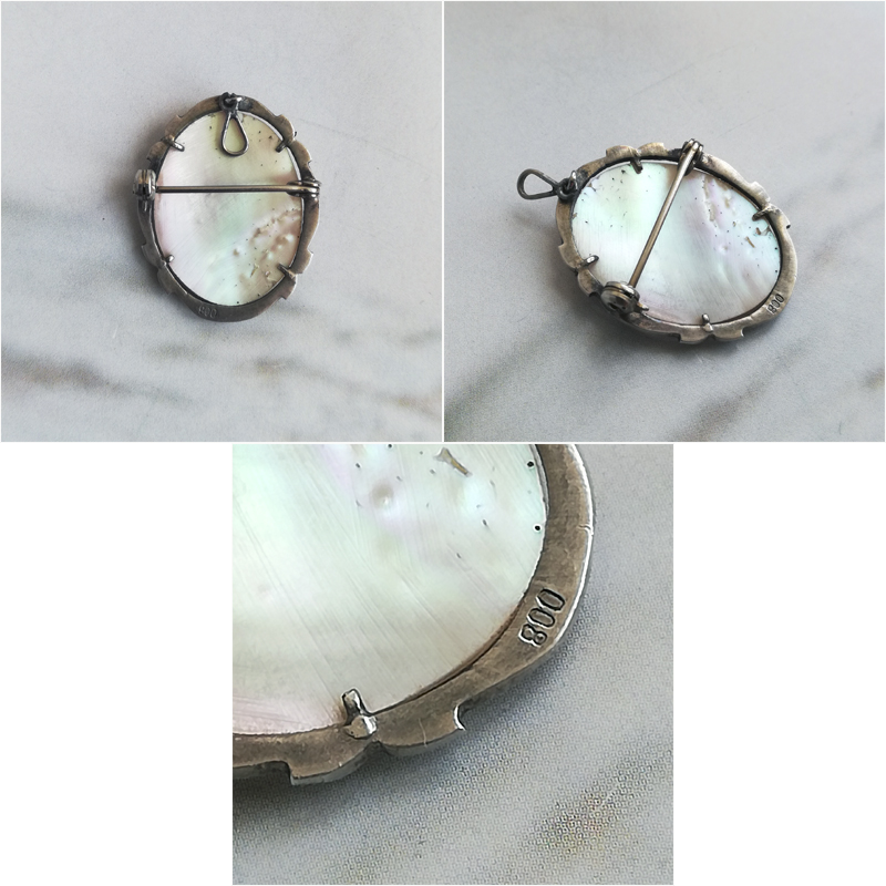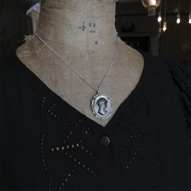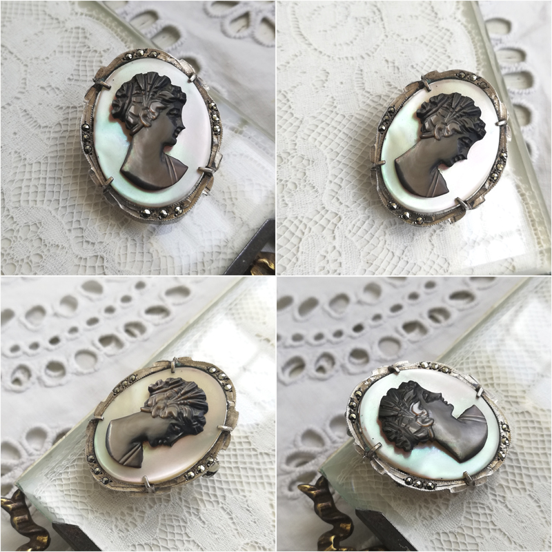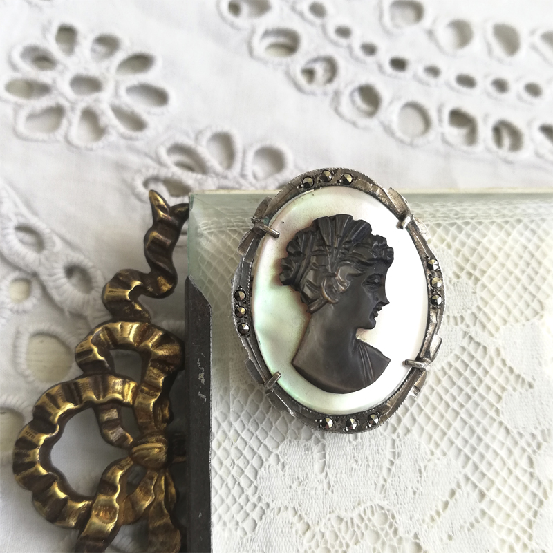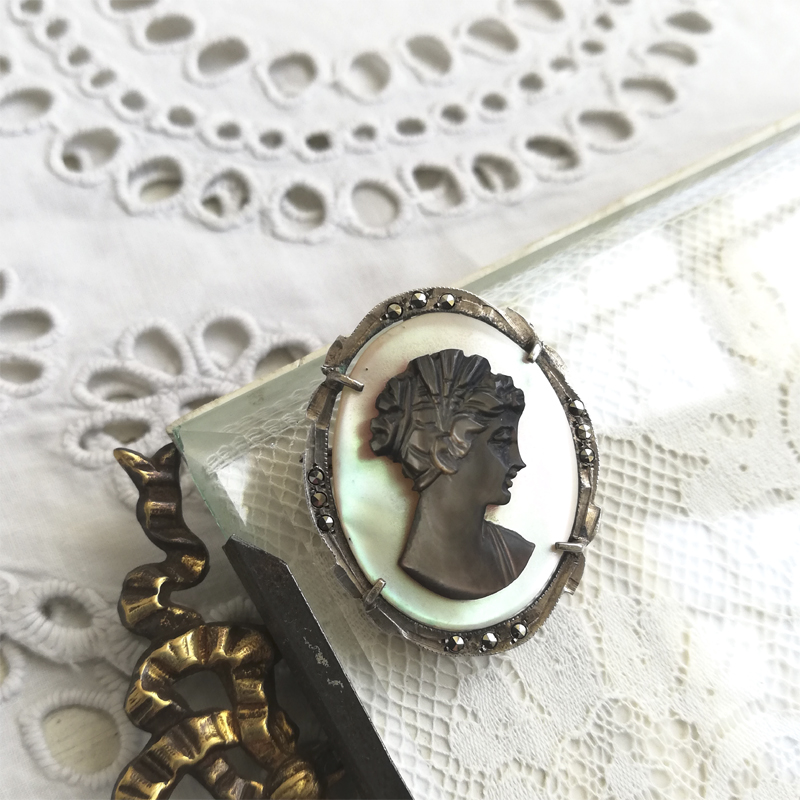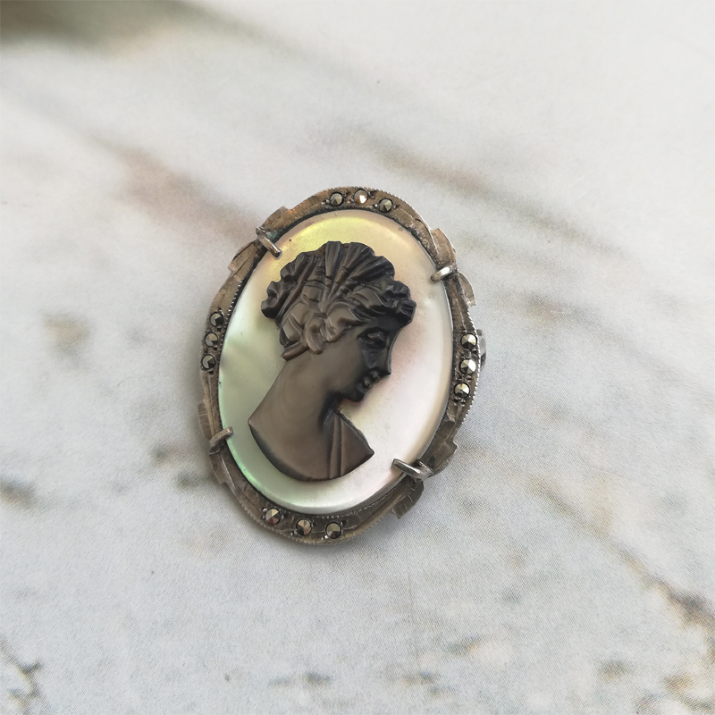 マザーオブパールの白い部分を背景にし、黒っぽい部分に笑みを浮かべた女性の横顔が彫られています。