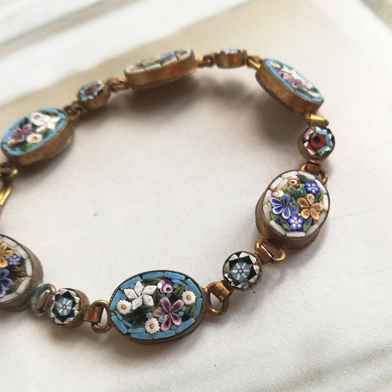 ブルーベースの楕円とホワイトベースの楕円のパーツが交互に、その合間に小さな円のパーツが連なったマイクロモザイクのブレスレットです。
