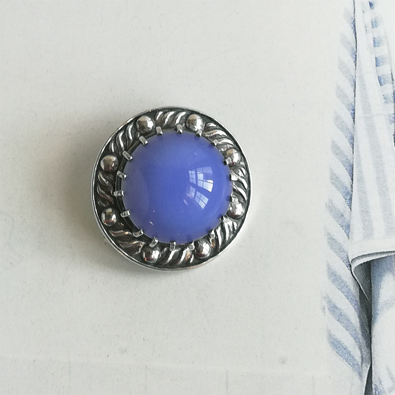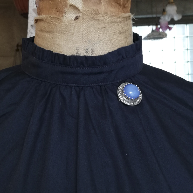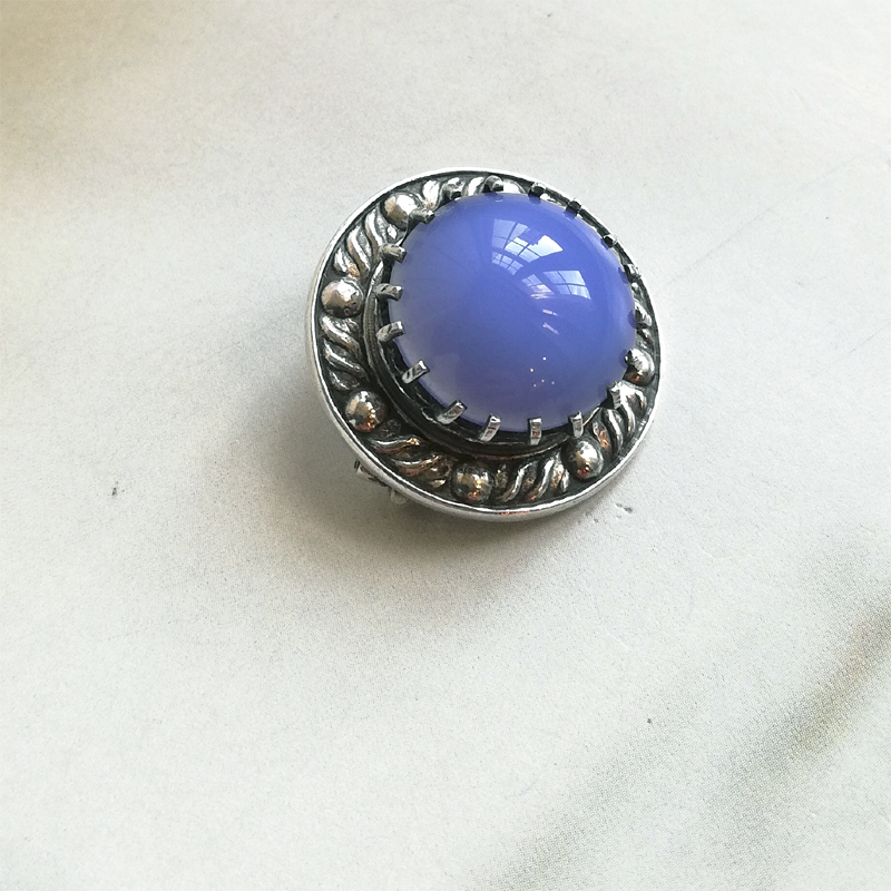 少しミルキーなブルーのカルセドニーのカボションをしっかり爪で囲ったブローチです。