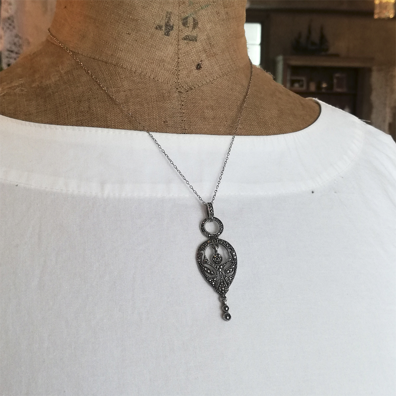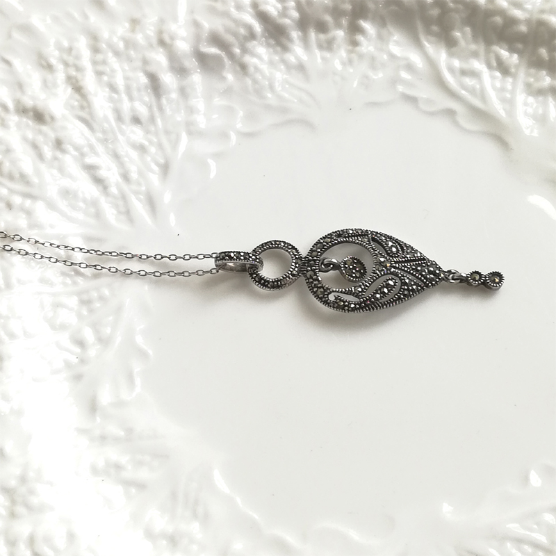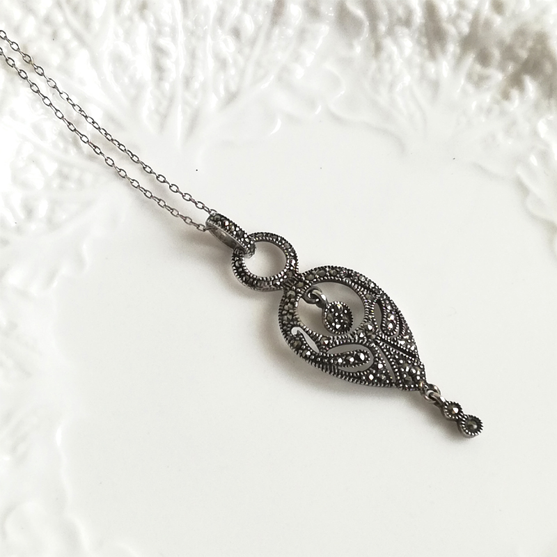 繊細な細工が美しいスターリングシルバーにマーカサイトがセットされたヴィンテージネックレスです。