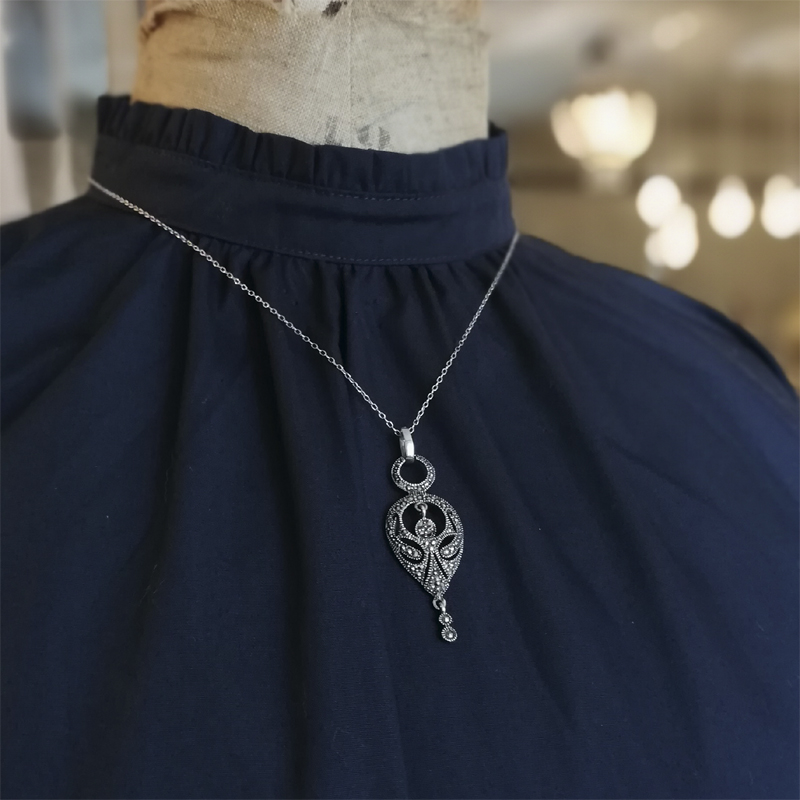 アールデコを思わせる洗練されたシルエットと縦長のラインが胸元をすっきりと見せてくれ、クラシカルでありながら普段の装いに取り入れやすいデザインです。