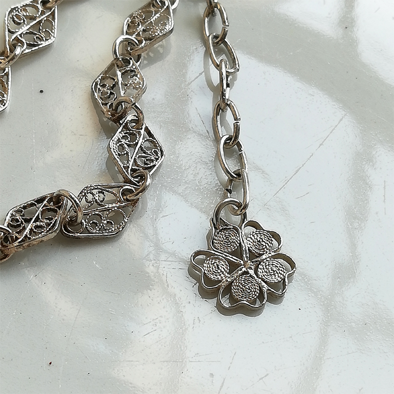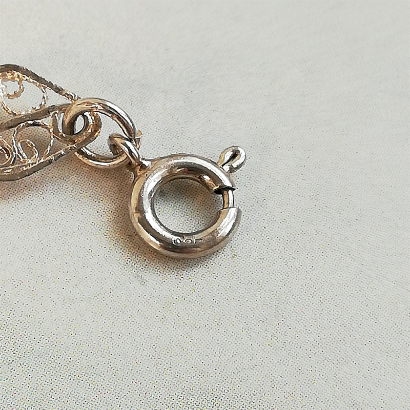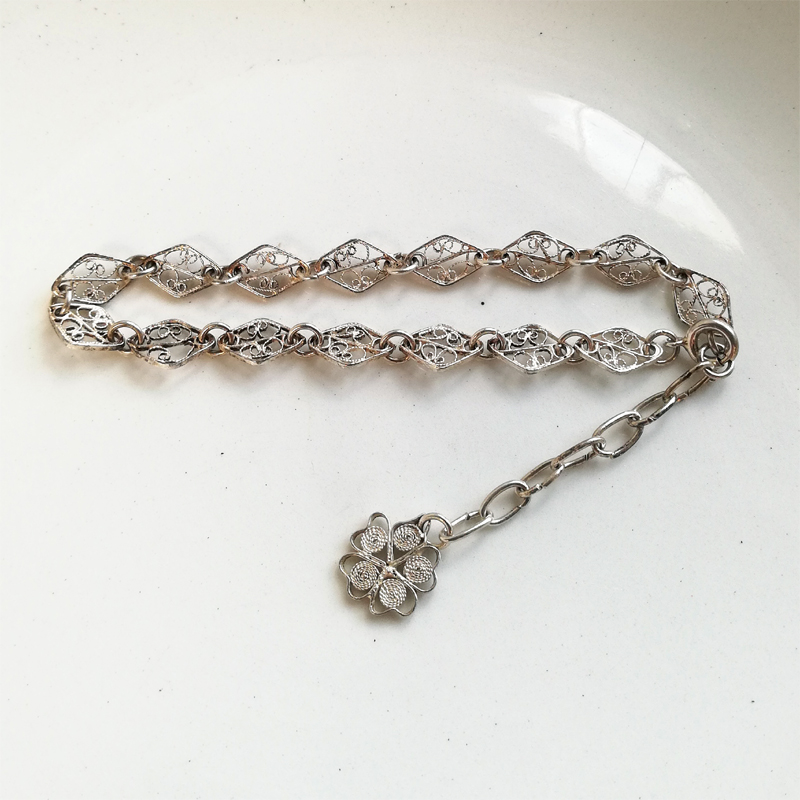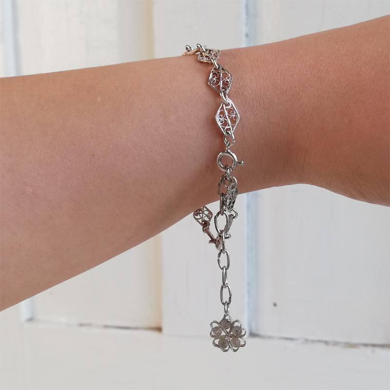 アジャスターチェーンの先に付いたチャームが揺れるフィリグリー(銀泉細工)のブレスレットです。