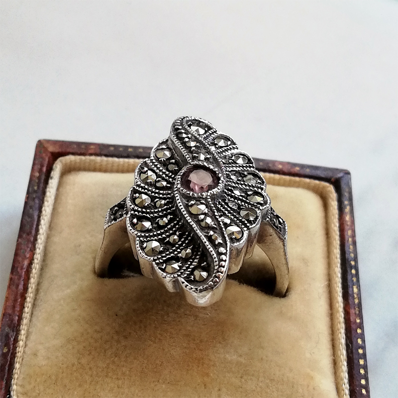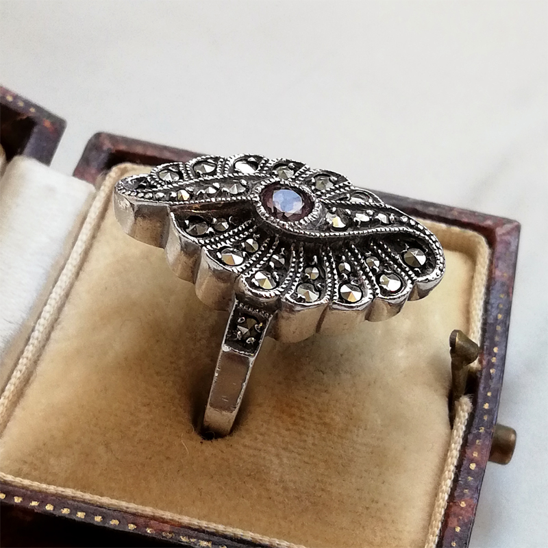 中央にベゼルセッティングされた淡いパープルのアメジスト、その周囲には大きさを違えたマーカサイトが隙間なくセットされています。
