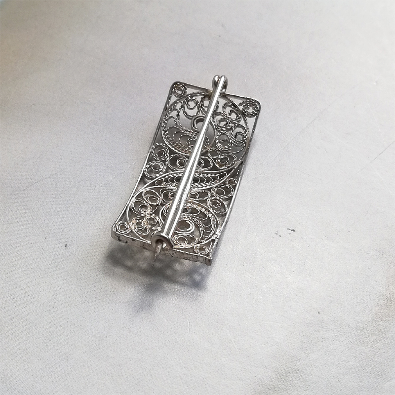少しカーブを描いたレクタングルのフィリグリーブローチ。