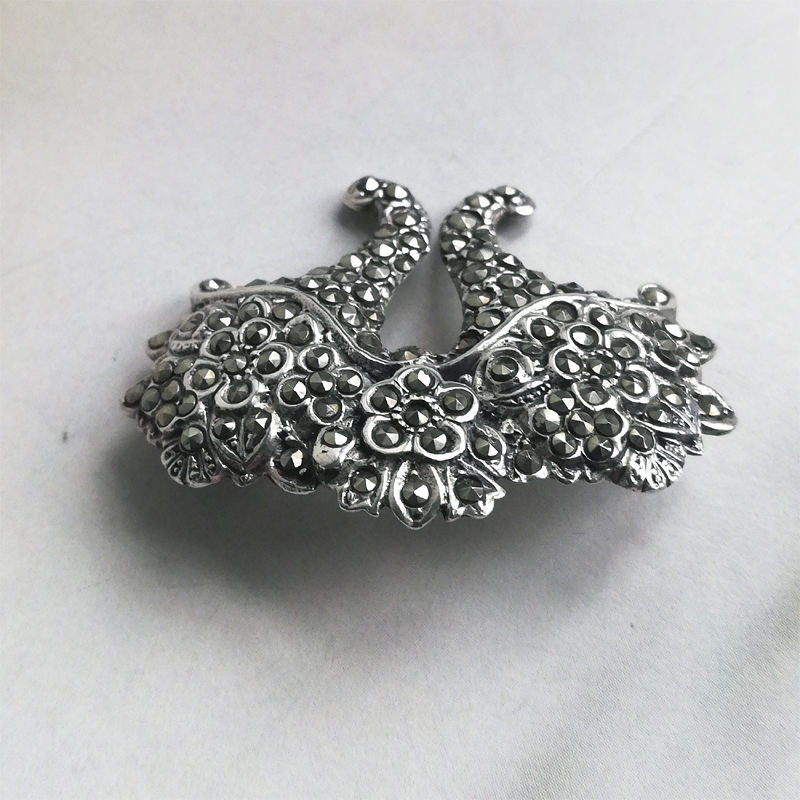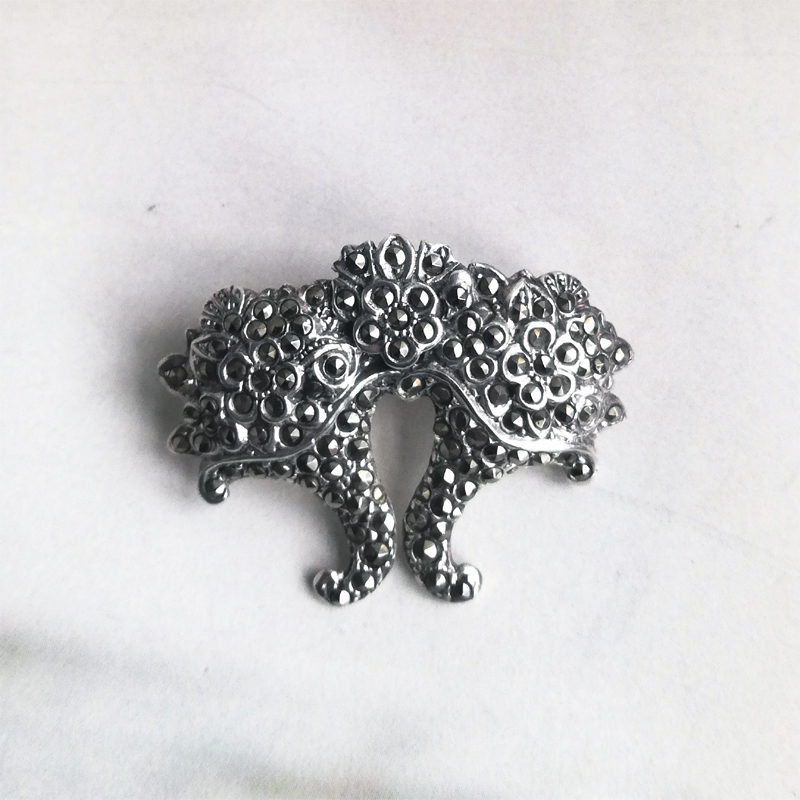 スターリングシルバーのマーカサイトが隙間なくセットされ、2つの花かごが寄り添ったようなブローチです。