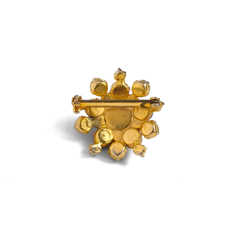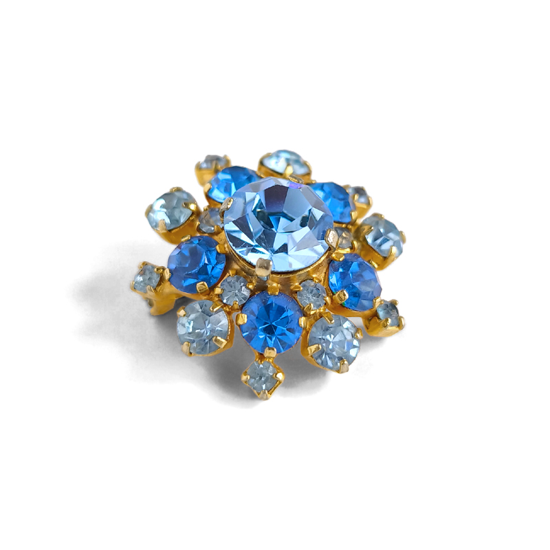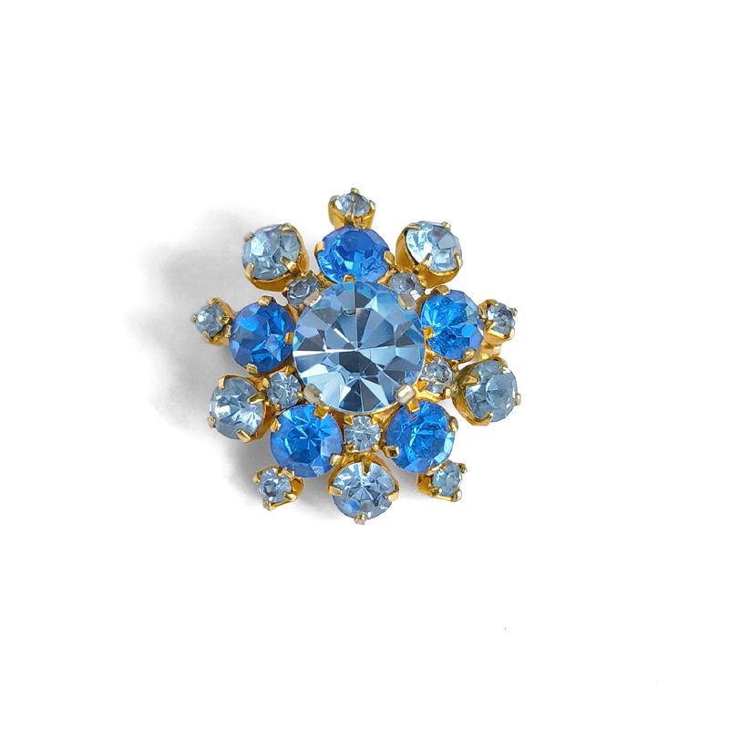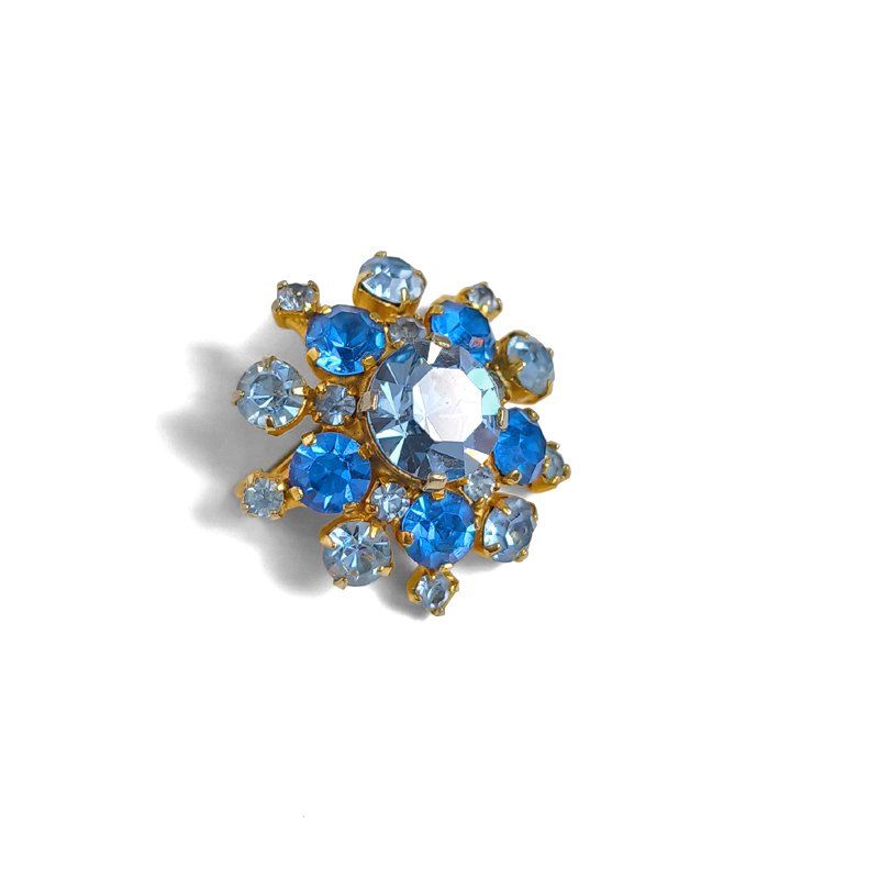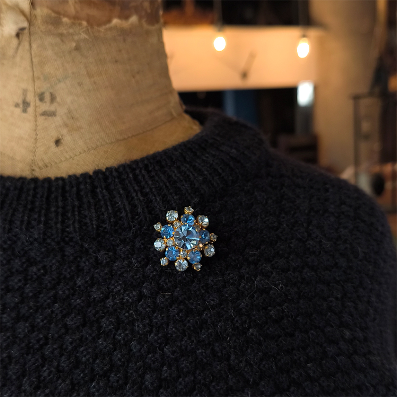 深みのある青と淡い水色のラインストーンを贅沢にあしらったヴィンテージブローチ。