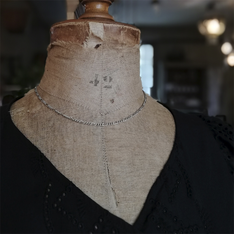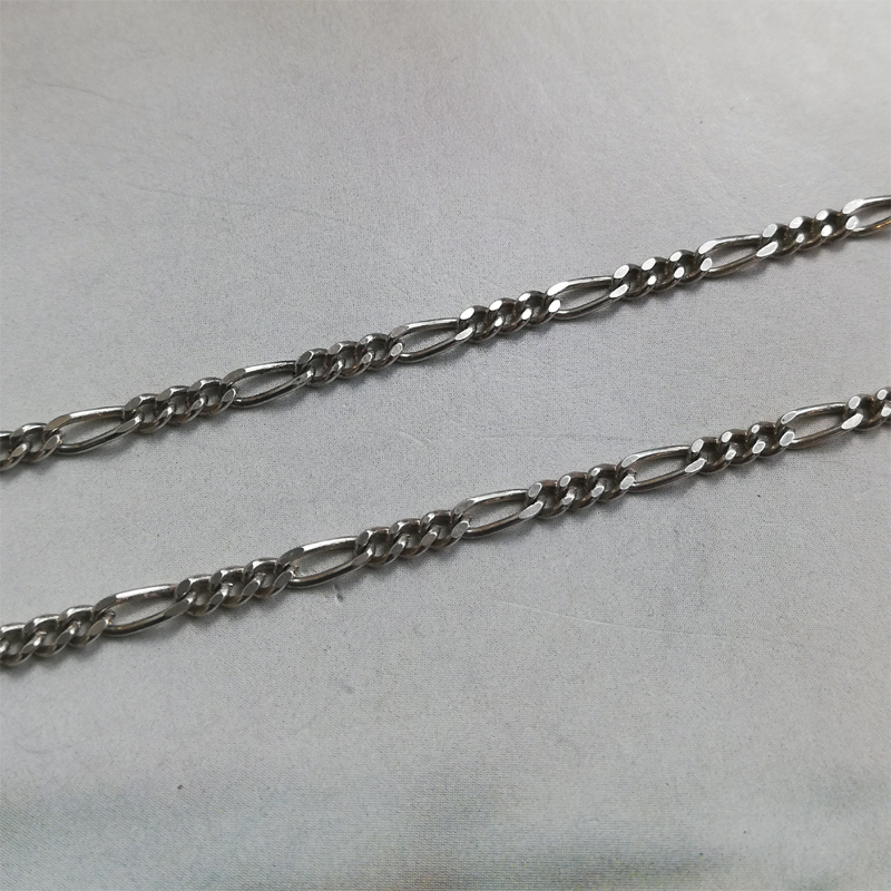 1つの長い楕円形のコマと2〜3つの短いコマを組み合わせたパターンを繰り返すフィガロチェーンと呼ばれるスターリングシルバーのヴィンテージチェーン。