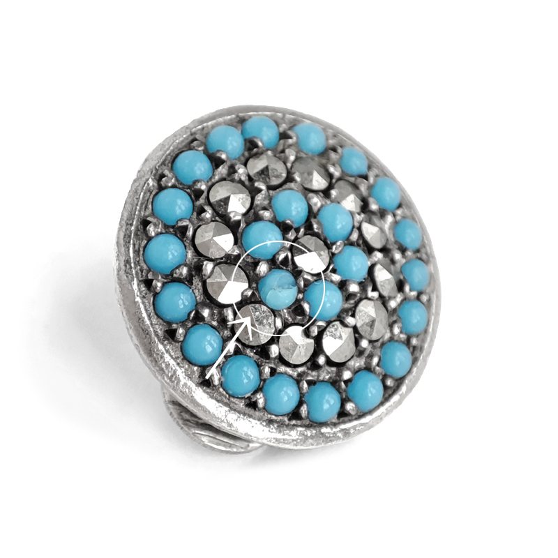 落ち着いたスターリングシルバーをベースに、マーカサイトの光が折り重なり、澄んだターコイズのブルーが美しく映えます。