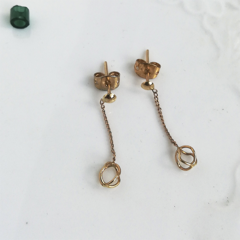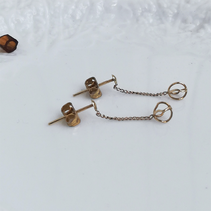 チェーンの先でオープンワークのモ輪のチーフが軽やかに揺れる9カラットゴールドのヴィンテージピアスです。