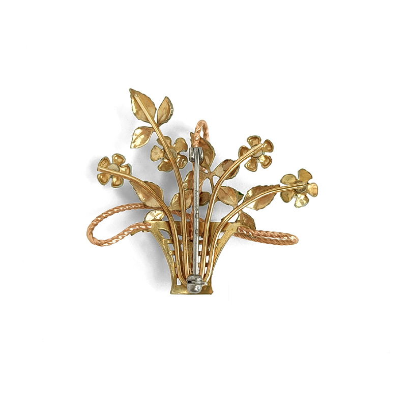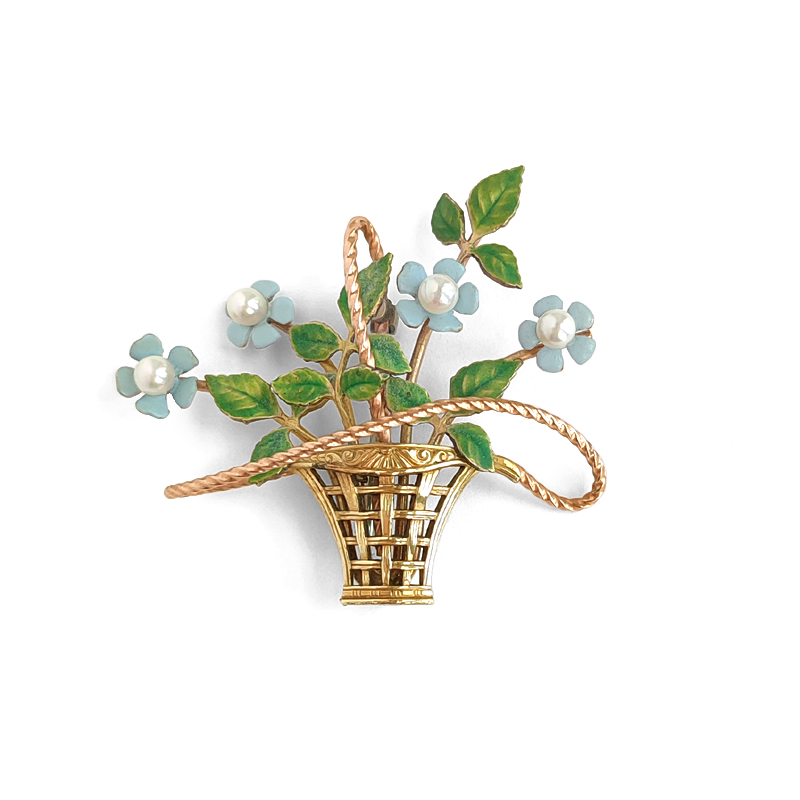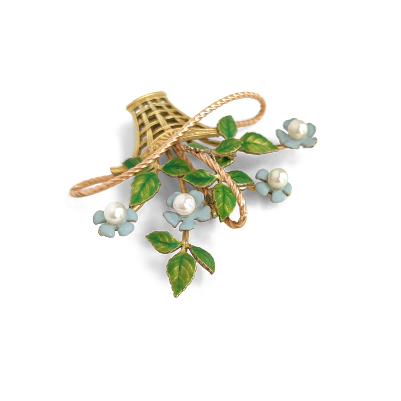 繊細なエナメルで表現された淡いブルーの花びらと、やわらかなグリーンの葉が瑞々しい印象です。