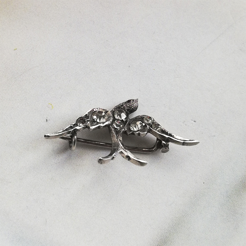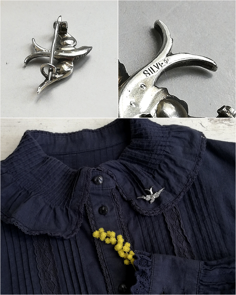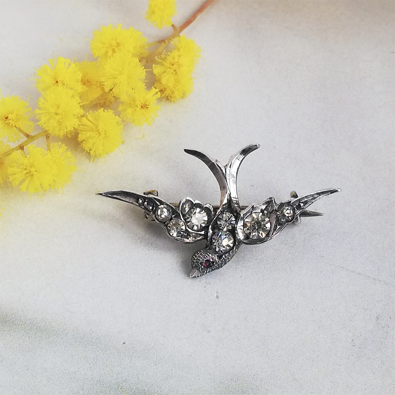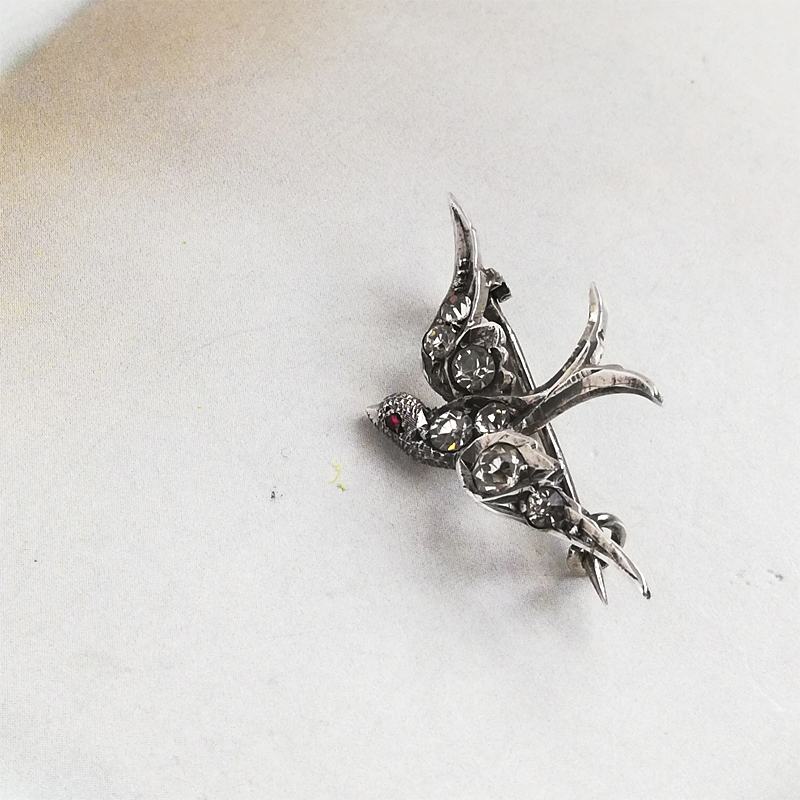 片側にレッドグラスアイを持つスターリングシルバーのツバメのブローチです。