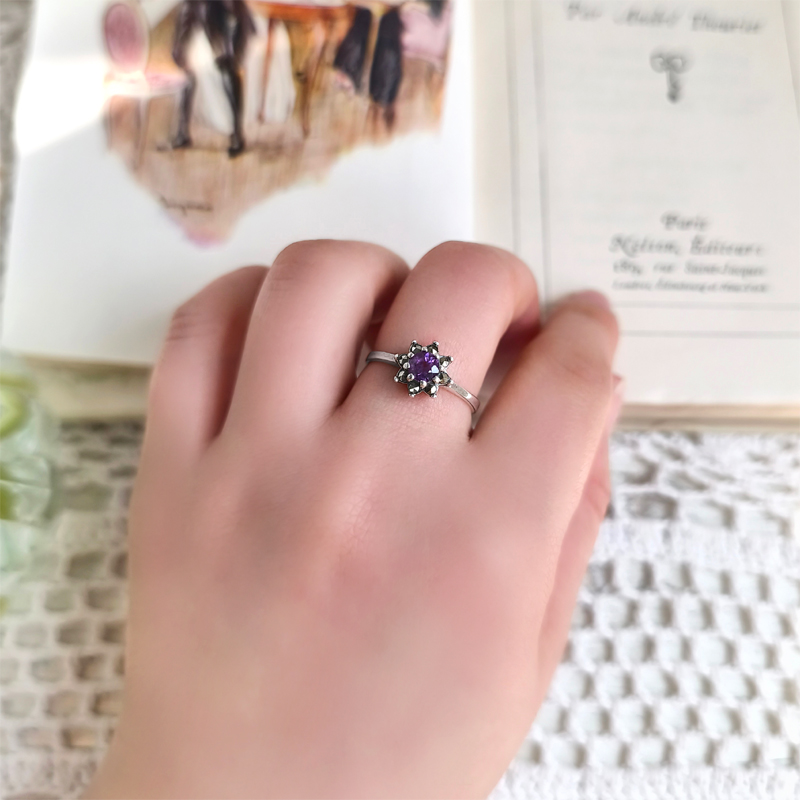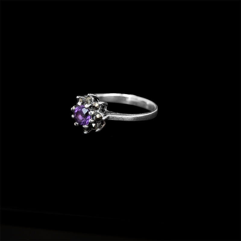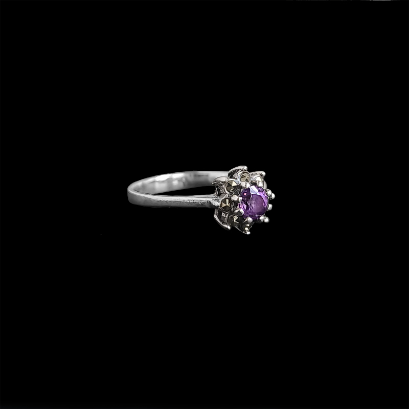 アメジストを中心に、繊細な輝きを添えるマーカサイトをセットしたシルバーリング。 異なる輝きを持つストーンが組み合わさることで、八芒星を象るデザインです。