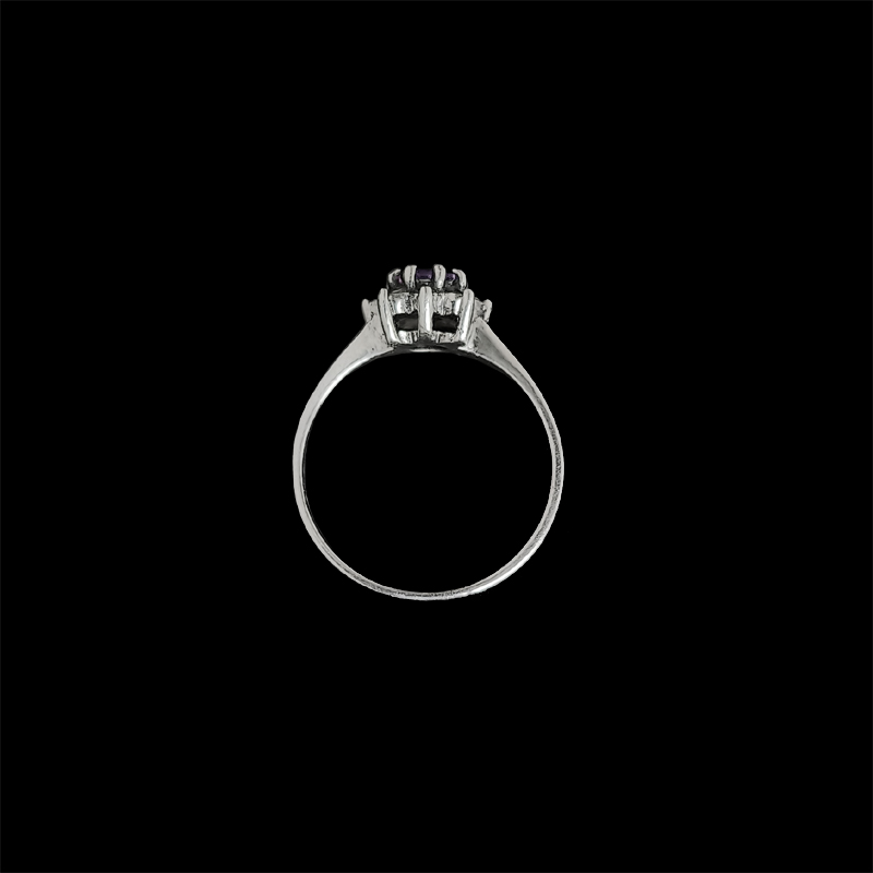 アメジストは爪留めされ石座に高さを出し、その一段下にマーカサイトが配置され、ボリューム感と立体感が出るように仕上げられています。