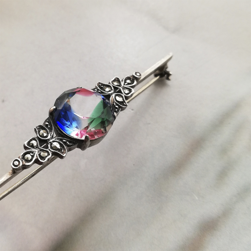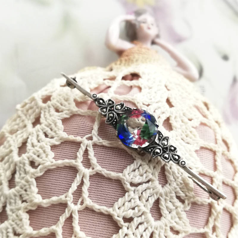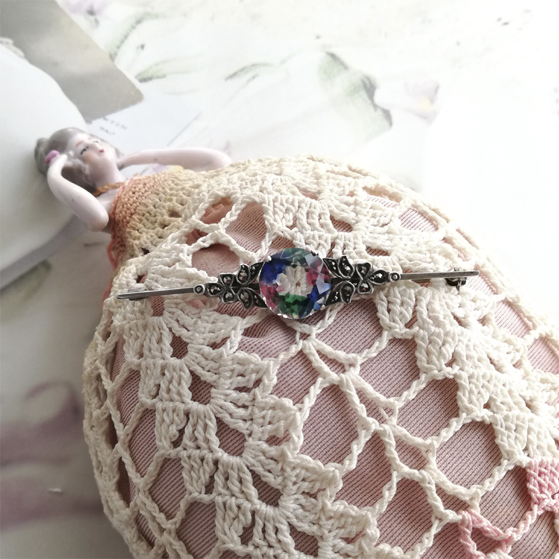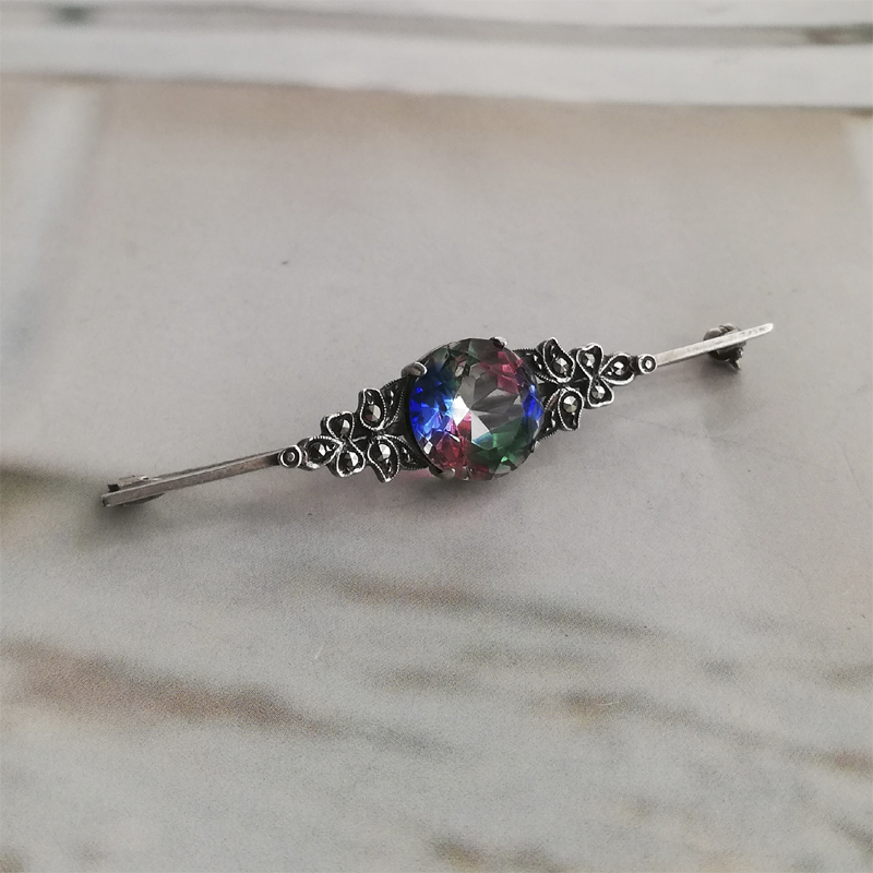 アイリスガラスの両側にはそれを引き立てながらも、より華やかさを添えるマーカサイトの装飾が施されています。