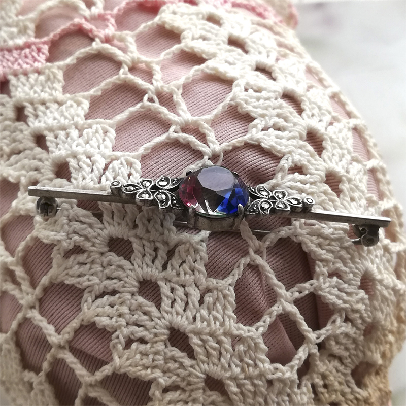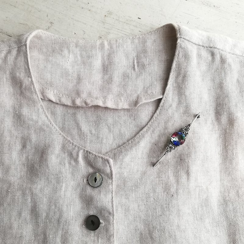 虹色の煌めきを閉じ込めた幻想的なアイリスガラスのバーブローチです。