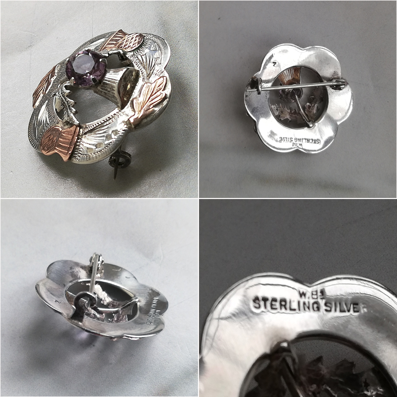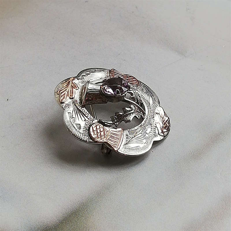 シルバーのサークルにはブライトカットが施され、金メッキされたアザミの花と葉のパーツがアップリケされた職人による手の込んだ装飾です。そして中央のアザミの花には天然アメジストが一粒あしらわれています。